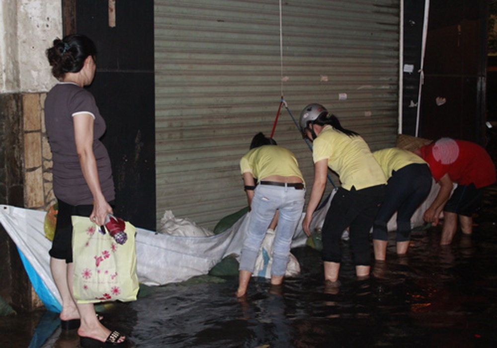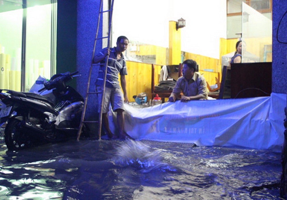 Vừa chắn sóng vừa canh nước đen tràn vào nhà ở đường Hòa Bình.