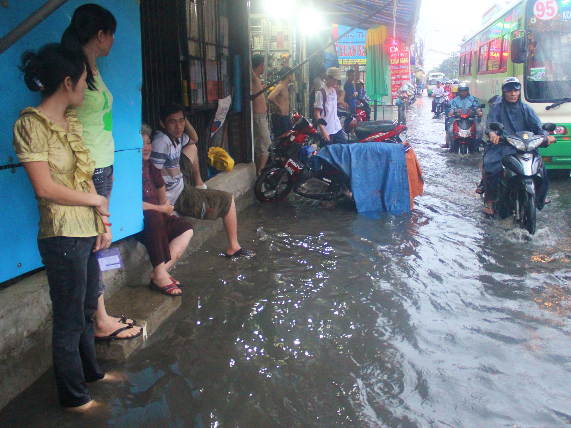 Có người còn xây dựng bờ tường để ngăn nước. Trong ảnh: Một số hộ dân xây bờ tường chống nước ngập trên đường Phan Huy Ích, Q.Gò Vấp.