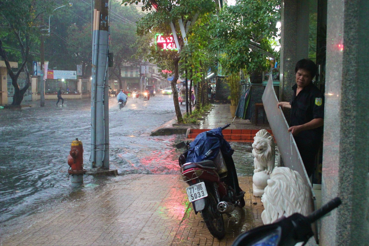 Một nhân viên cửa hàng dùng tấm ván chắn sóng nước đánh vào ở đường Đồng Đen (Q.Tân Bình) chiều 3/9.