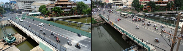 | Cầu Lê Văn Sỹ phía đường Hoàng Sa xây mới (ảnh trái) và cầu Lê Văn Sỹ trước khi xây (ảnh phải). |