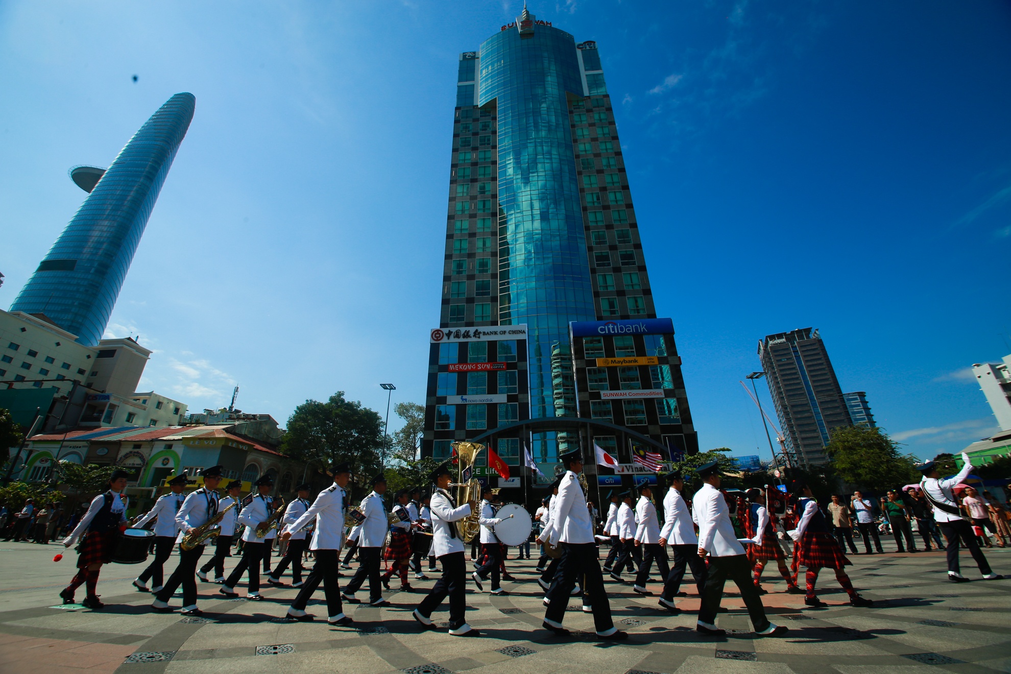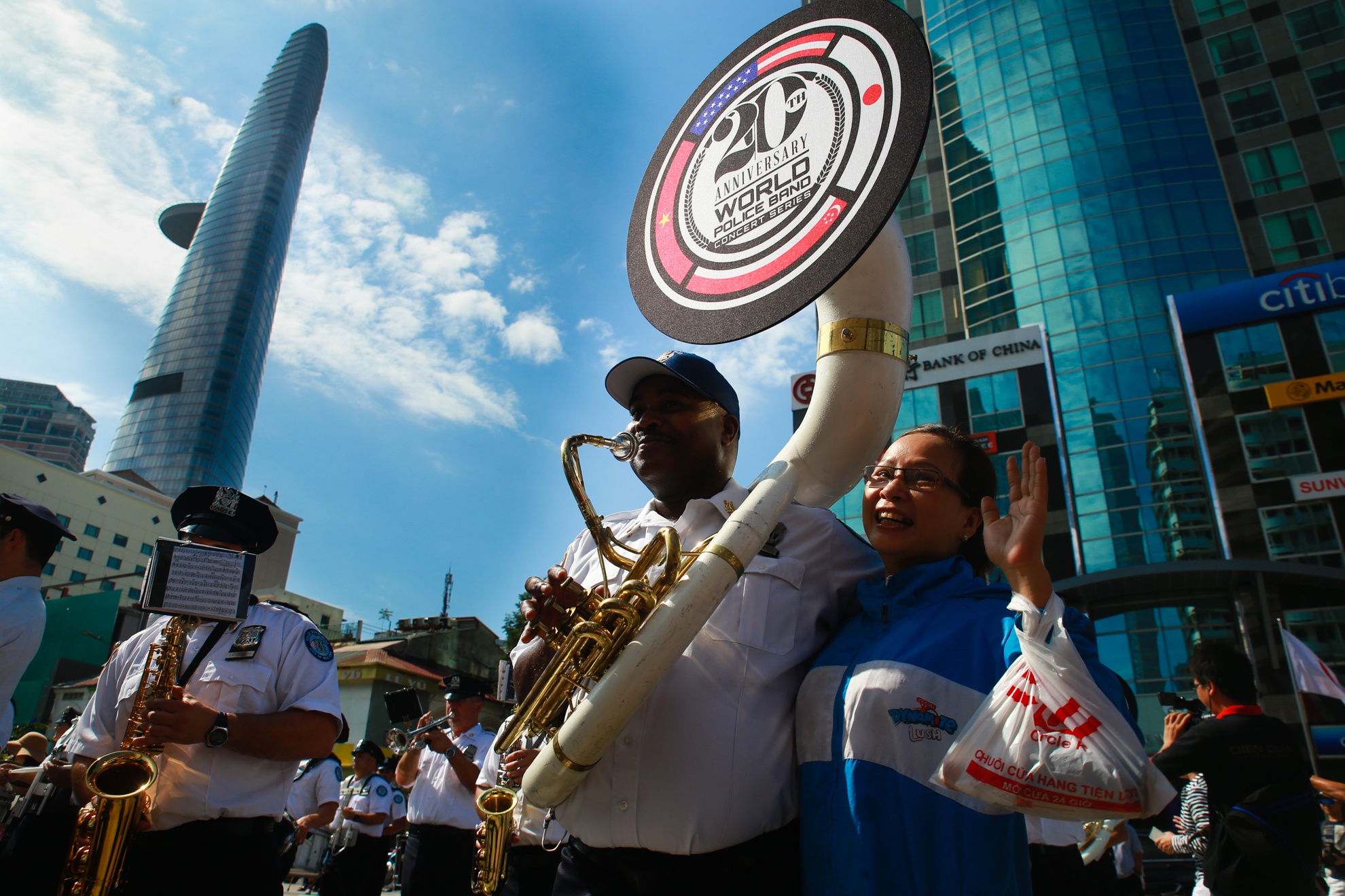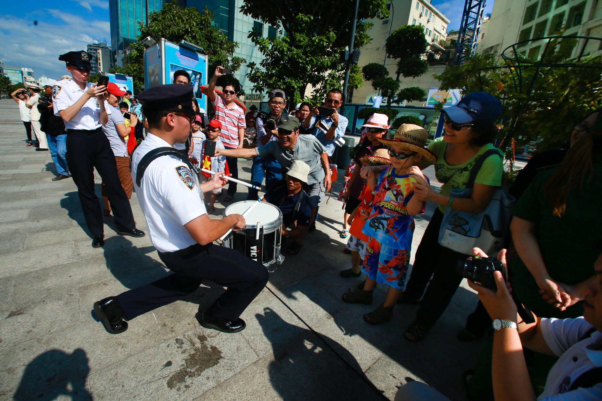 Hàng nghìn người dân Sài Gòn đổ ra đường xem 200 cảnh sát Mỹ, Nhật, Singapore và Việt Nam biểu diễn quân nhạc ở trung tâm thành phố trong không khí giao lưu thân thiện.