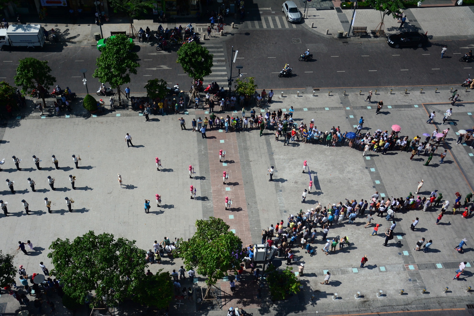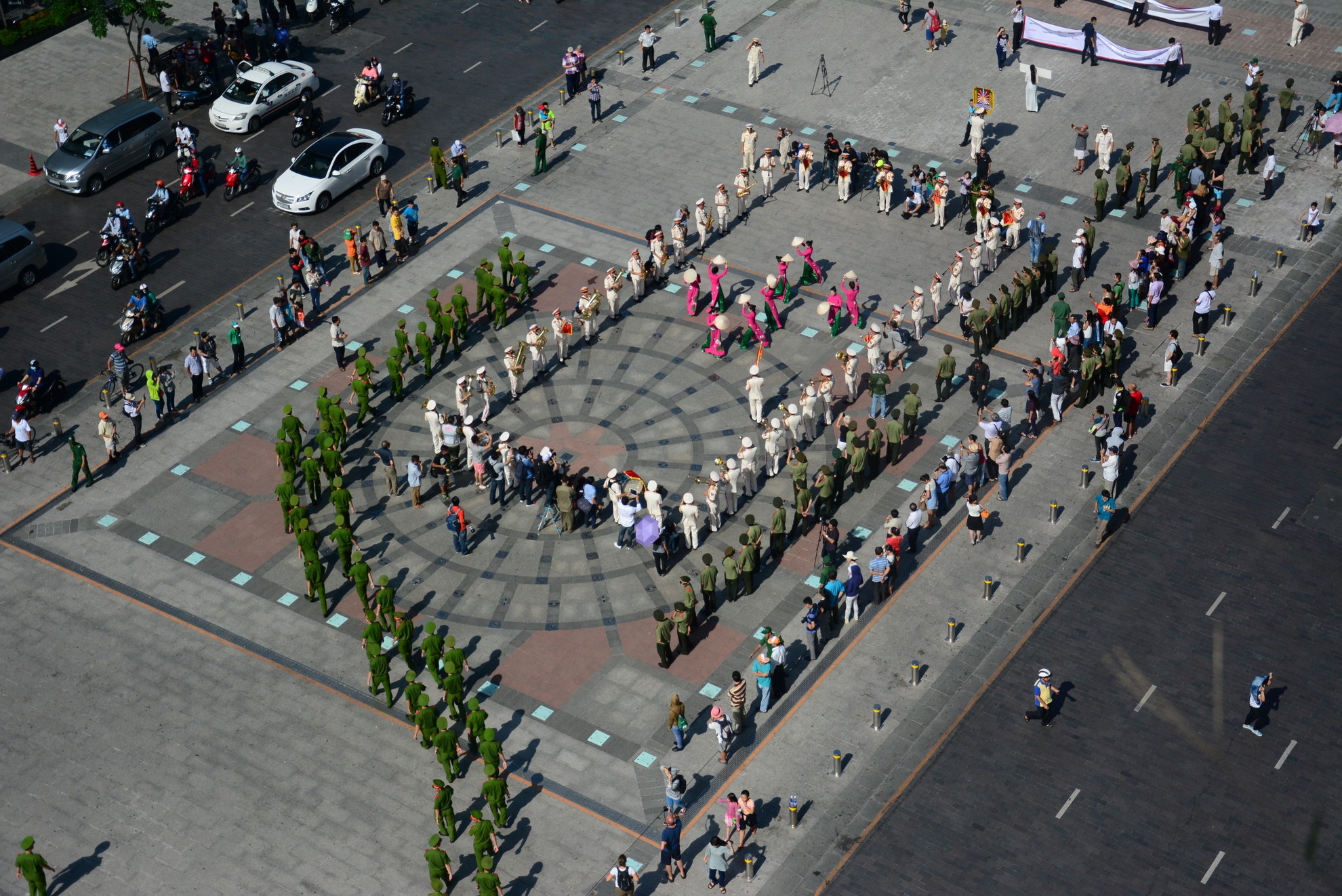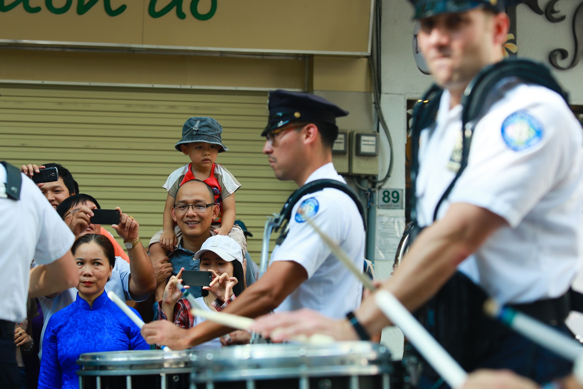 Hàng nghìn người dân Sài Gòn đổ ra đường xem 200 cảnh sát Mỹ, Nhật, Singapore và Việt Nam biểu diễn quân nhạc ở trung tâm thành phố trong không khí giao lưu thân thiện.
