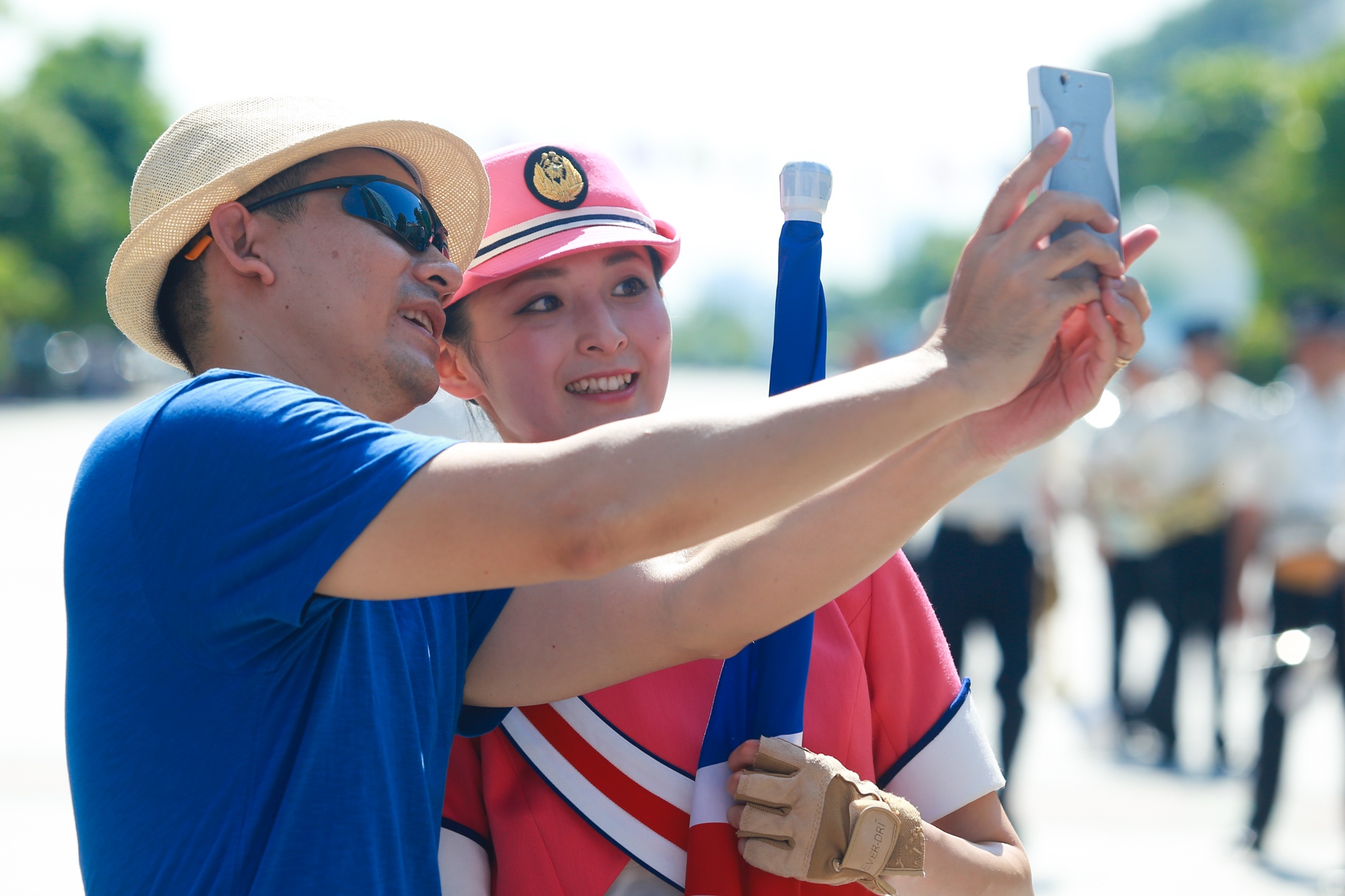 | Một người tham quan trên phố chụp ảnh selfie cùng nữ cảnh sát quân nhạc Osaka. |