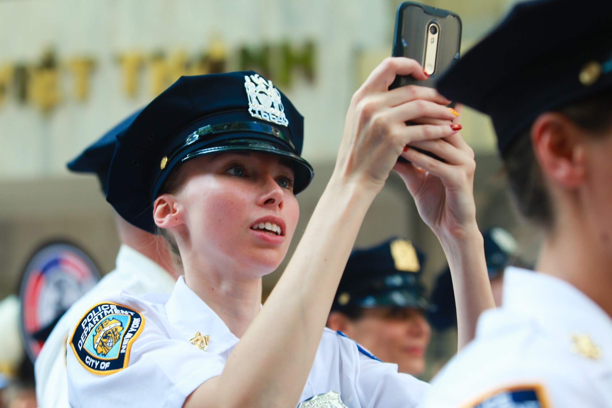 | Nữ cảnh sát New York lưu lại hình ảnh người dânxem trình diễn. |