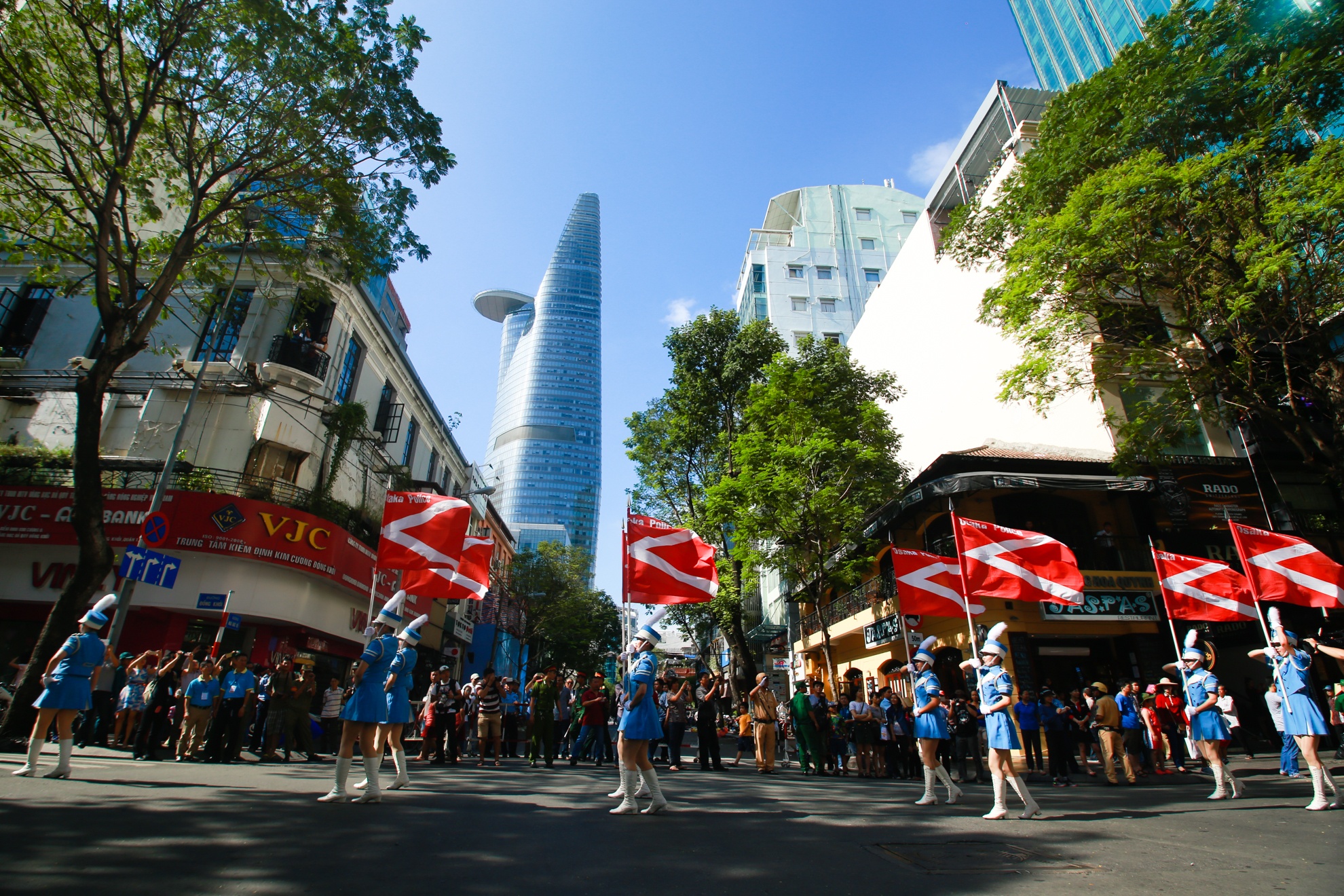 | Sáng 14/11, rất đông người dân Sài Gòn tập trung ở các tuyến đường Đồng Khởi, Tôn Đức Thắng, phố đi bộ Nguyễn Huệ để xem màn trình diễn quân nhạc của hơn 200 cảnh sát quốc tế. |