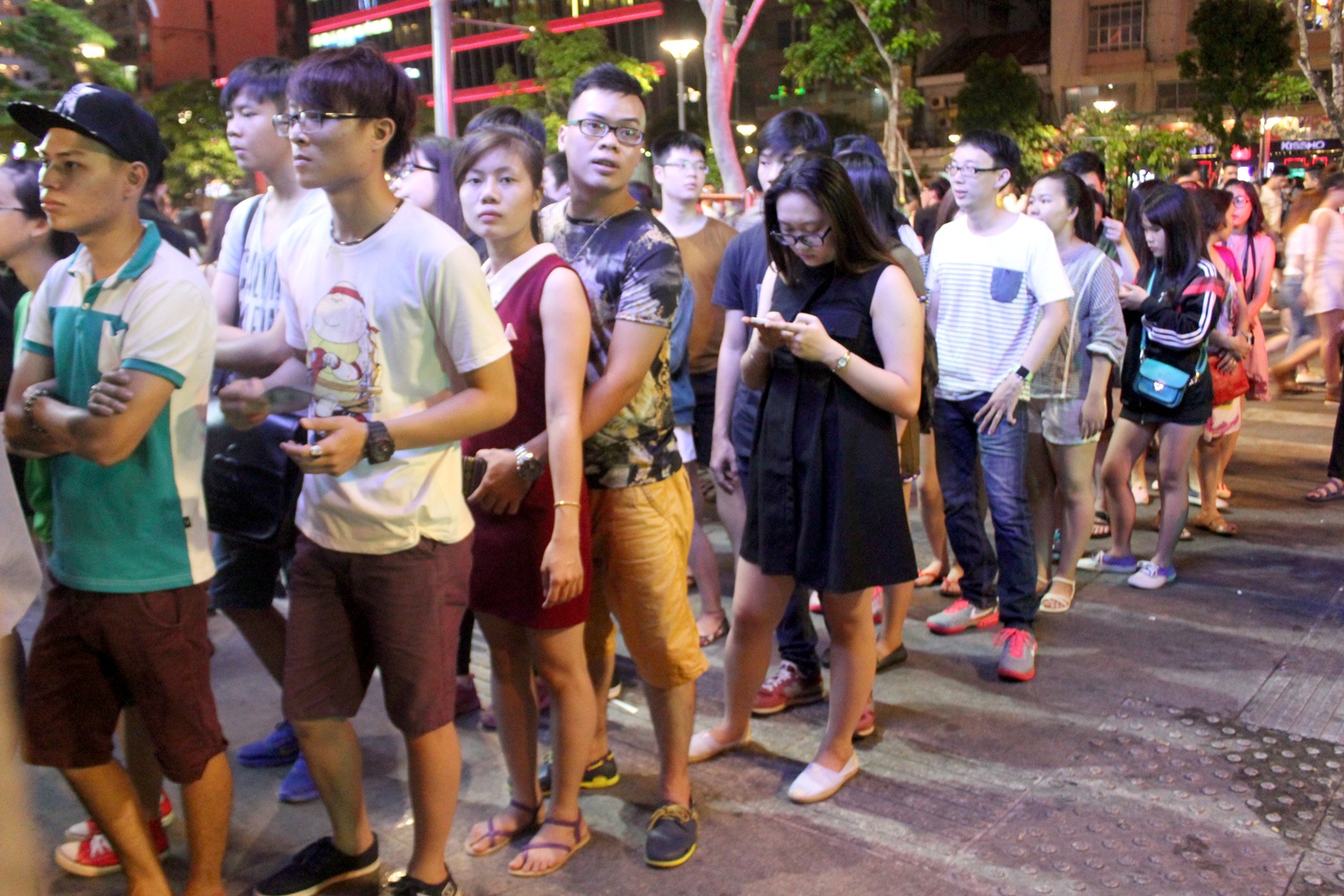 Tại phố đi bộ Nguyễn Huệ , hàng nghìn người chen chân chờ xem màn biểu diễn bắn pháo hoa. Để mua được đồ ăn, nước uống, khách phải xếp hàng dài mệt mỏi. Anh Thịnh (Bình Thạnh) cho biết, để có chổ ngồi cho gia đình của mình anh phải đến giữ chỗ từ lúc 17h. Dù khách đông nhưng quán không thu thêm bất kỳ phụ phí nào. Tuy vậy, khó khăn nhất là tìm chỗ gửi xe ở khu vực trung tâm, với giá 20.000 đồng mỗi lượt song cũng không còn chỗ trống.