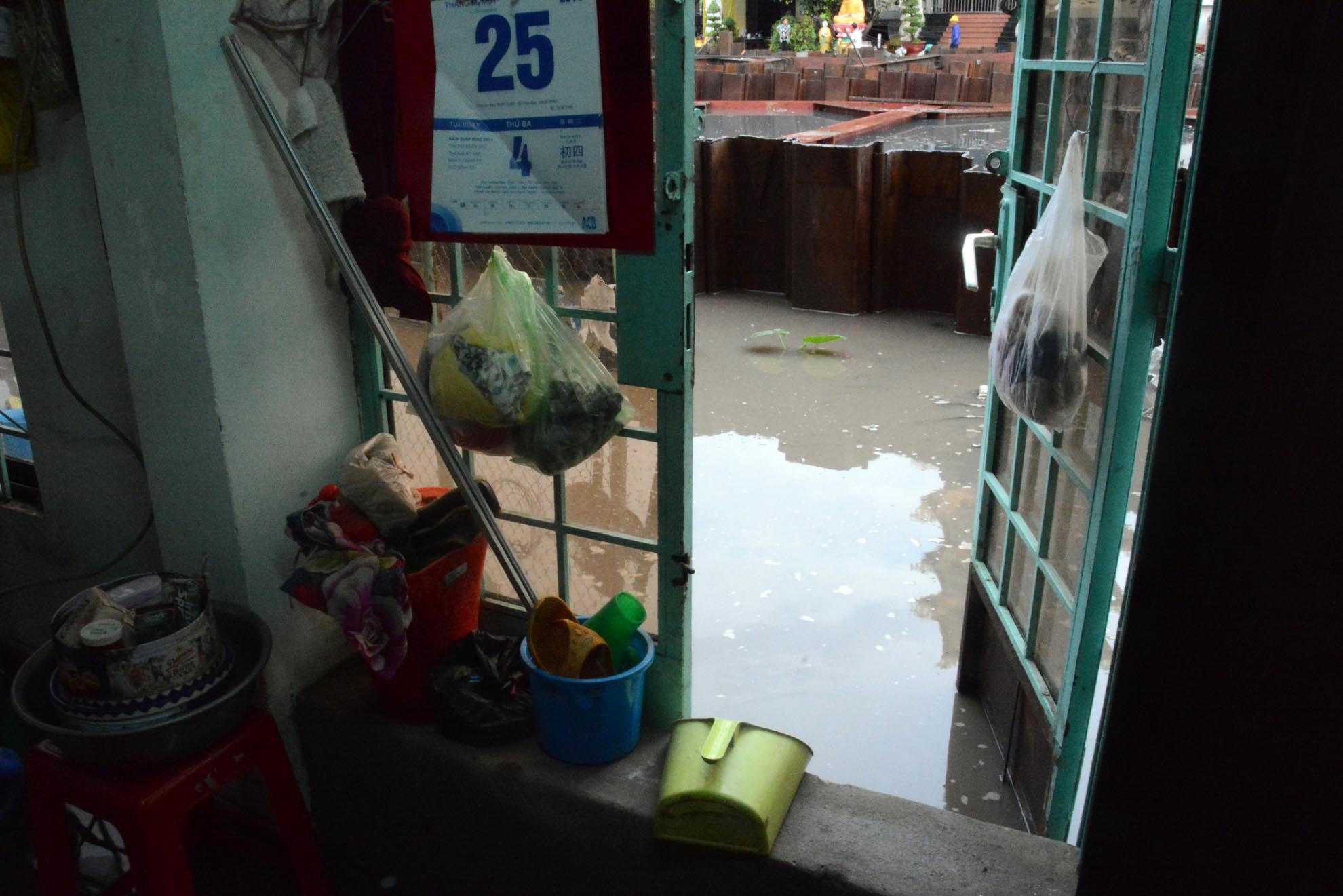 | Số nhà 125 đường Tân Hóa (phường 14, quận 6) ngập nước từ trong nhà ra ngoài sân. Bên cạnh là con kênh đen ngòm nước dâng cao. |