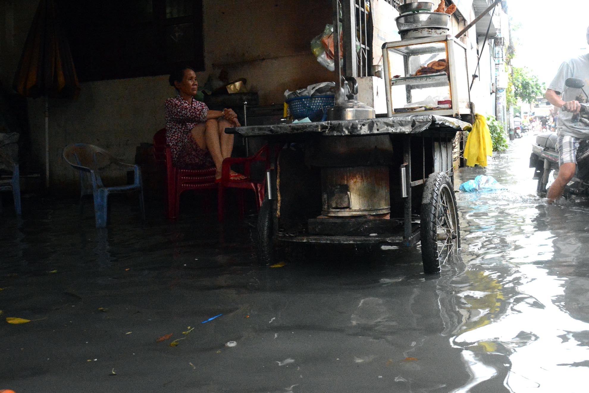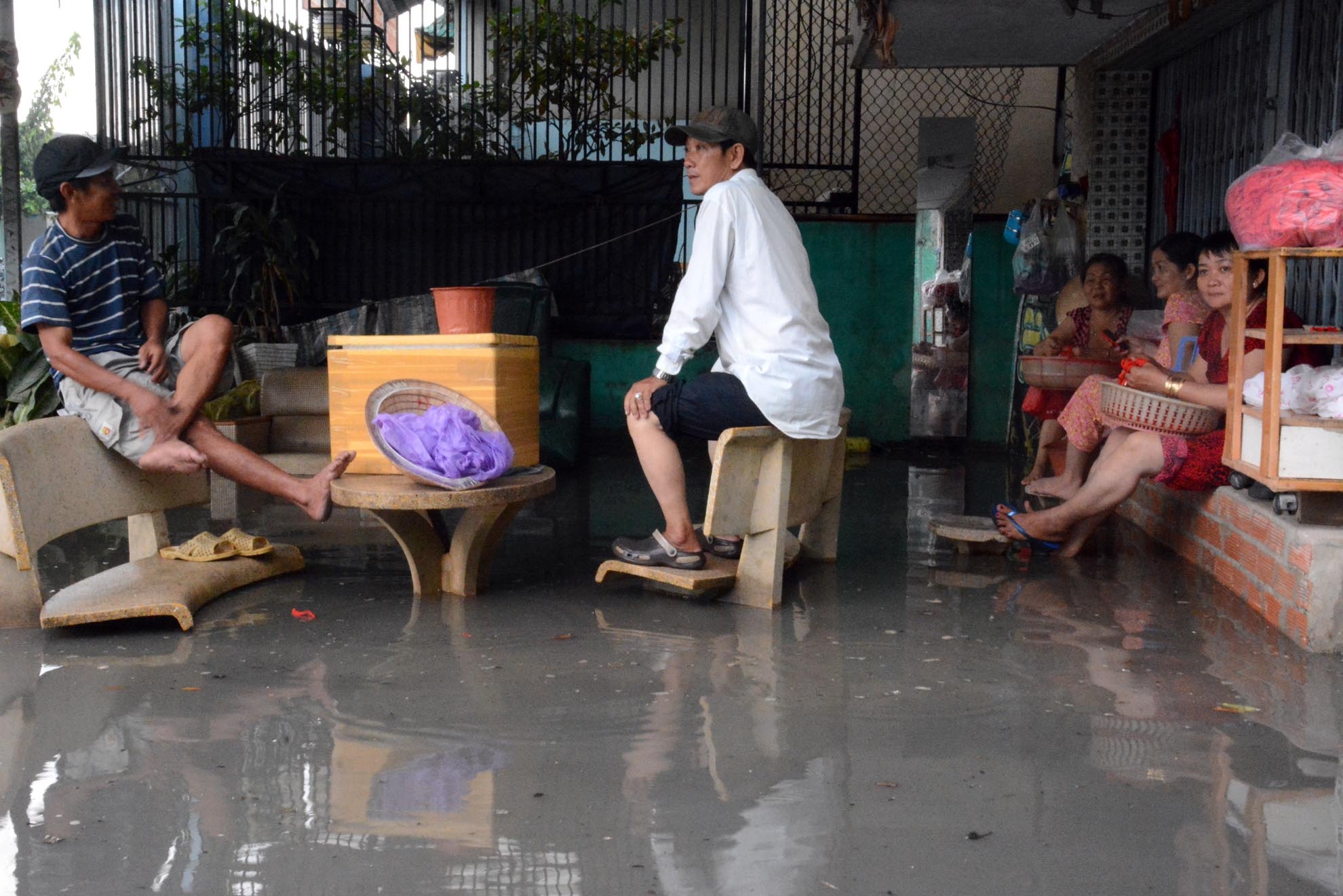 | Người dân tại con hẻm 89, đường Tân Hóa ngán ngẩm ngồi nhìn nước ngập, bốc mùi hôi thối. |