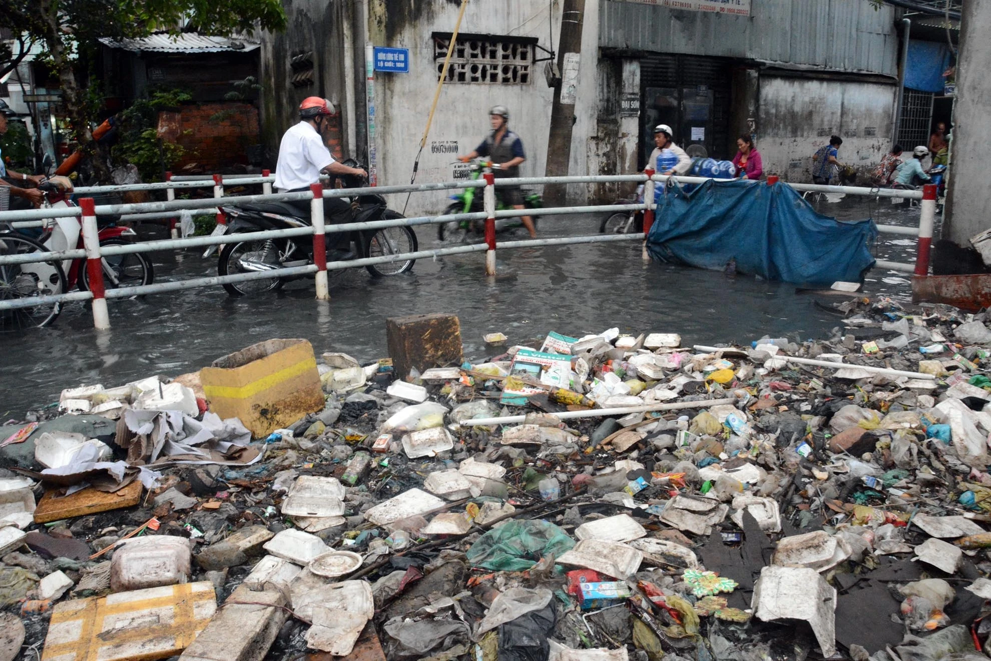 Cơn mưa chiều 25/11 kết hợp triều cường khiến các tuyến đường, hẻm và nhà dân bên công trình kênh Tân Hóa - Lò Gốm ngập nặng. Nước từ kênh tràn ra đường bốc mùi hôi thối.