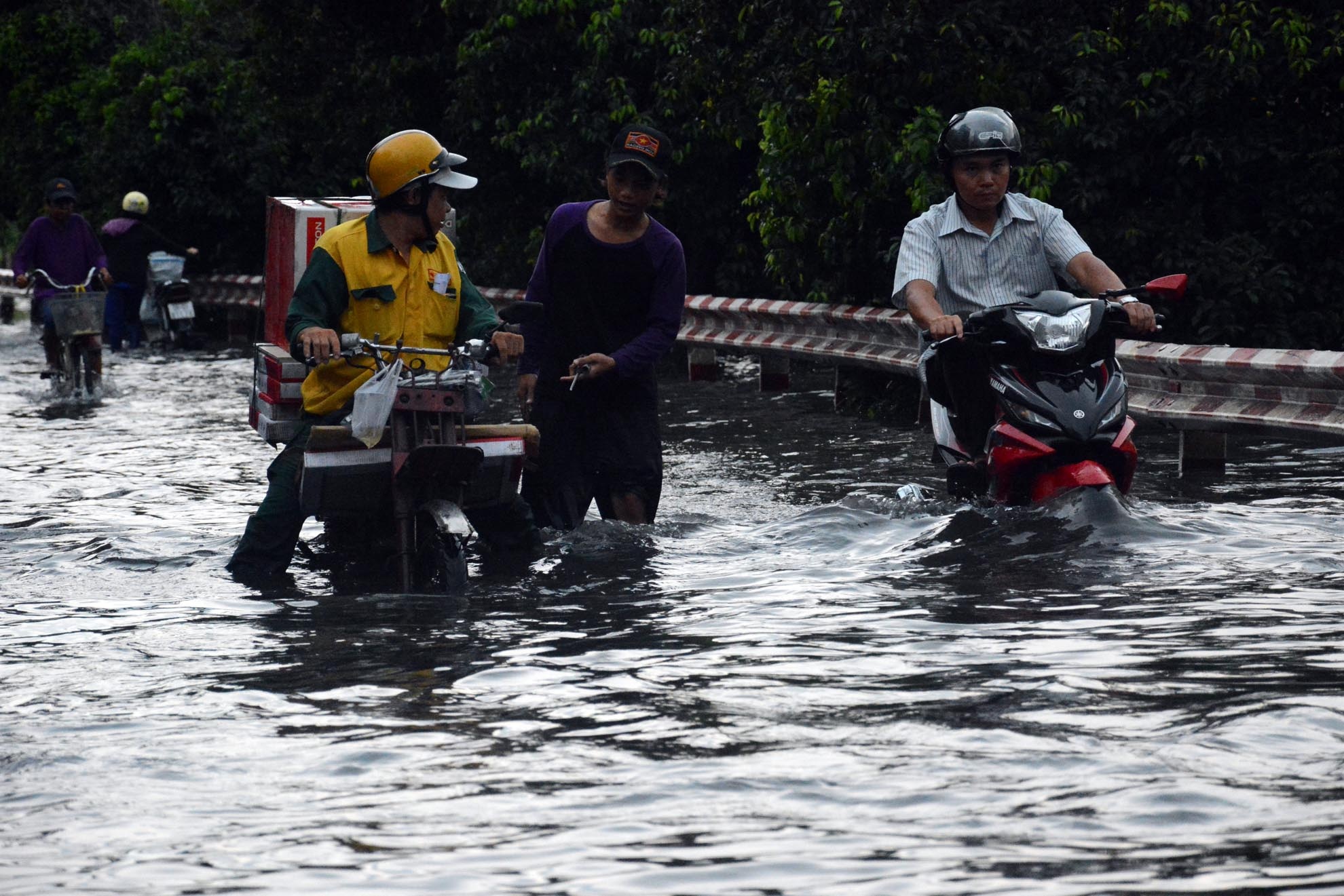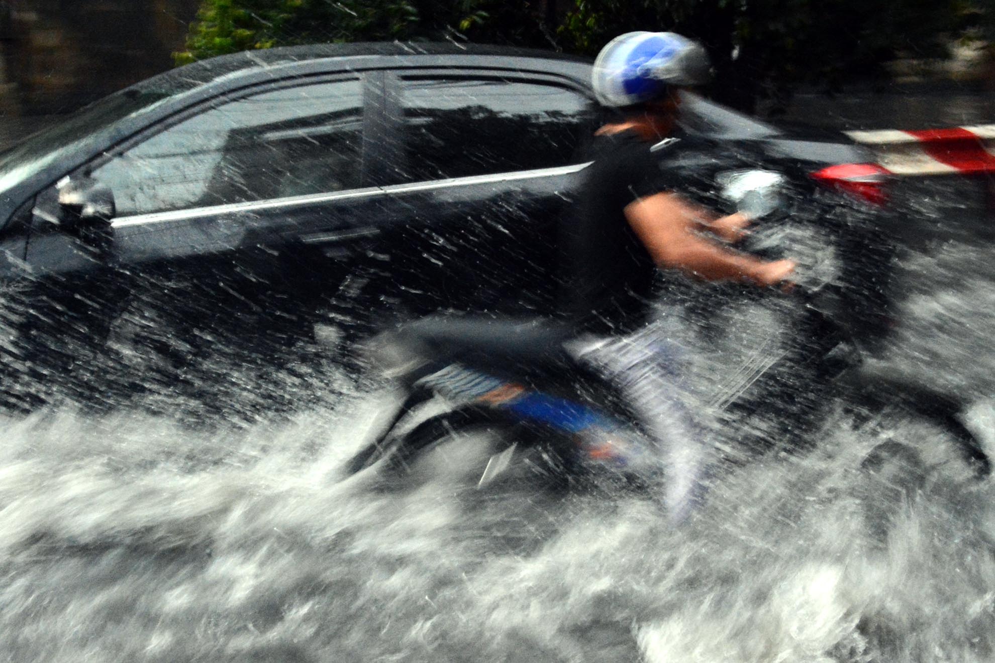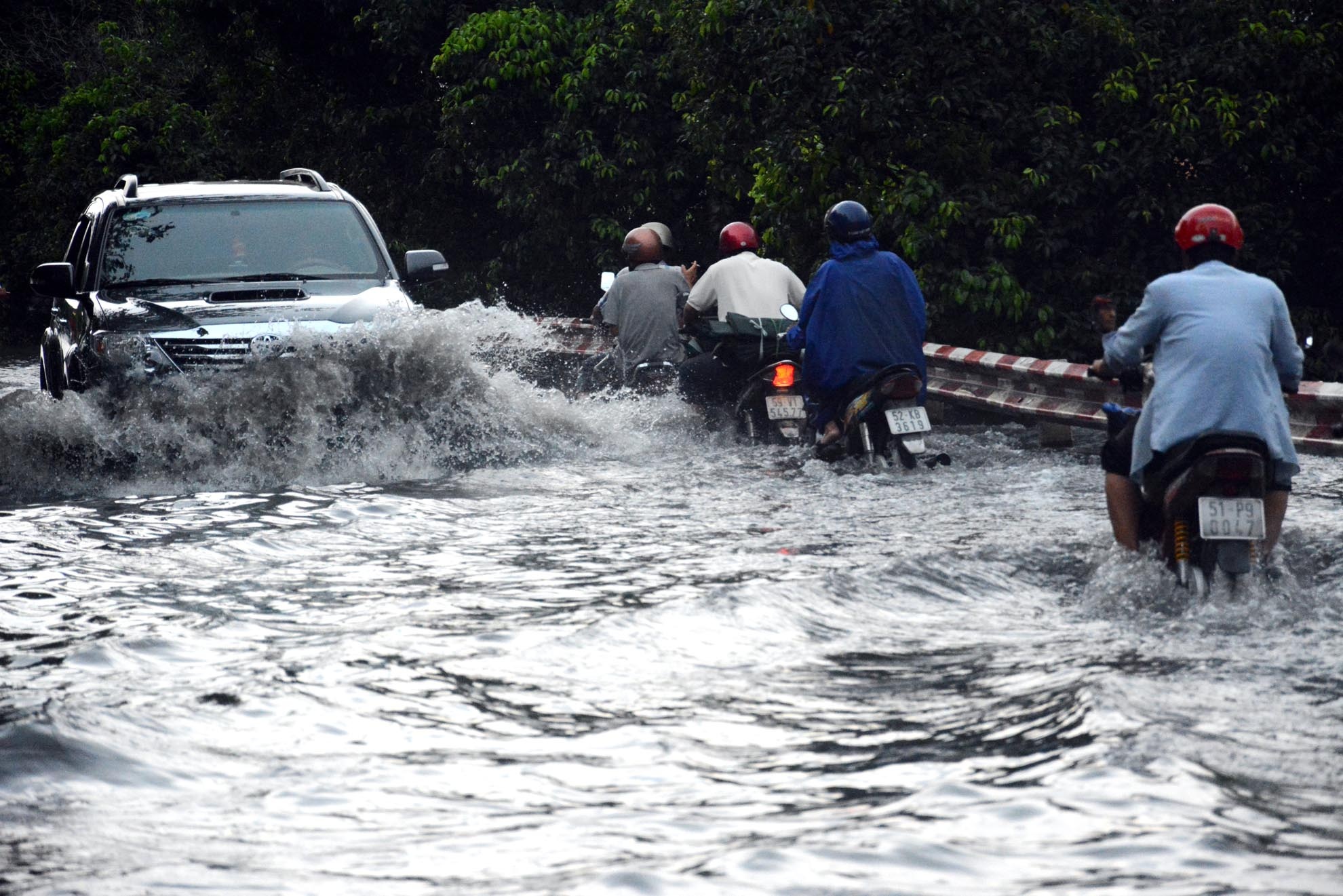 | Nhiều người điều khiển xe máy bị sóng nước ôtô đánh vào ướt nhèm. |
