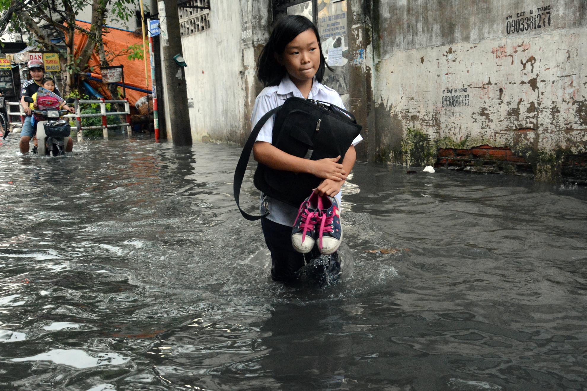 | Thời điểm nước dâng đúng vào giờ tan sở nên nhiều học sinh phải bì bõm lội nước về nhà. |