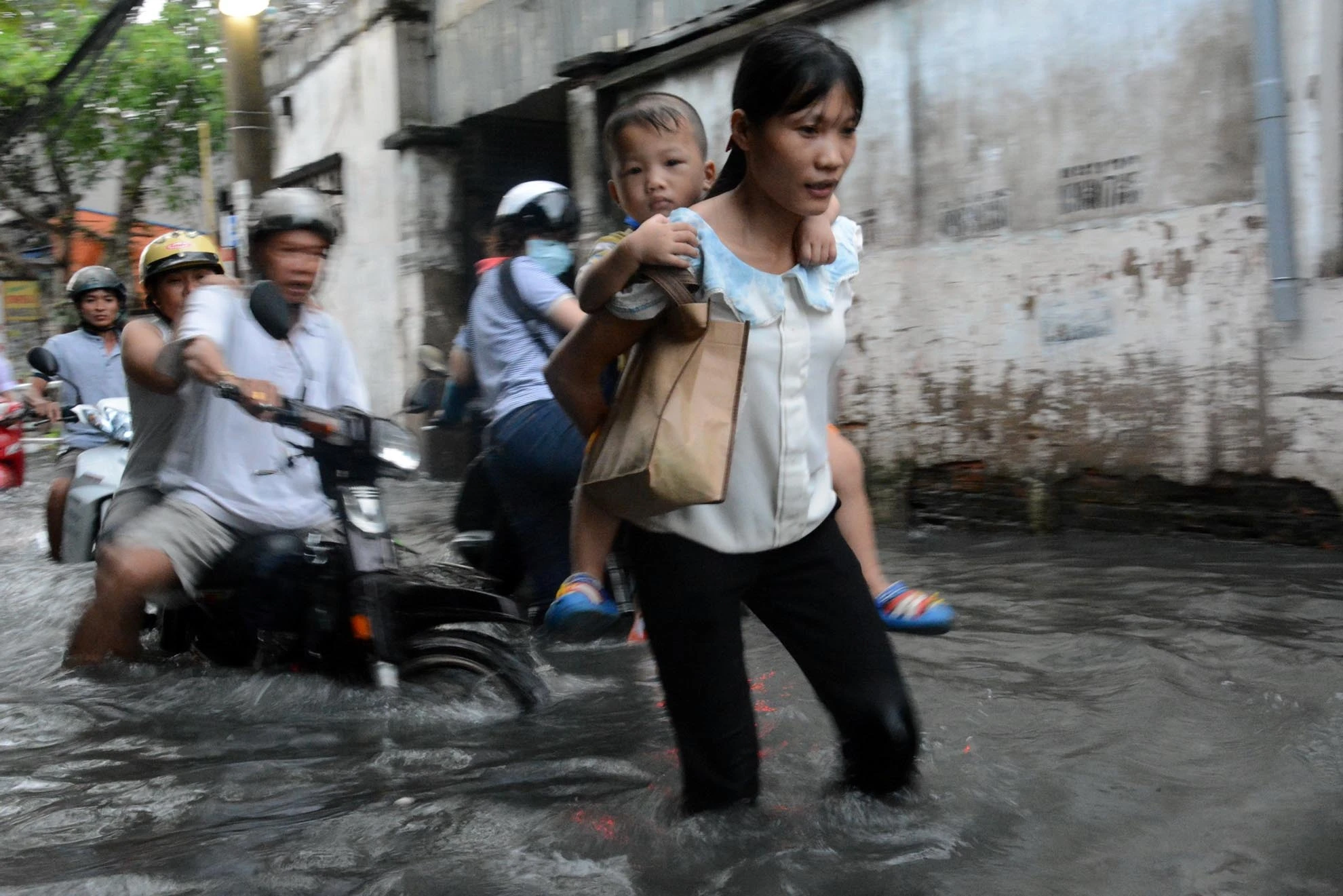 | Phụ huynh cùng trẻ lội nước đen bốc mùi hôi thối trên đường Lương Thế Vinh. |