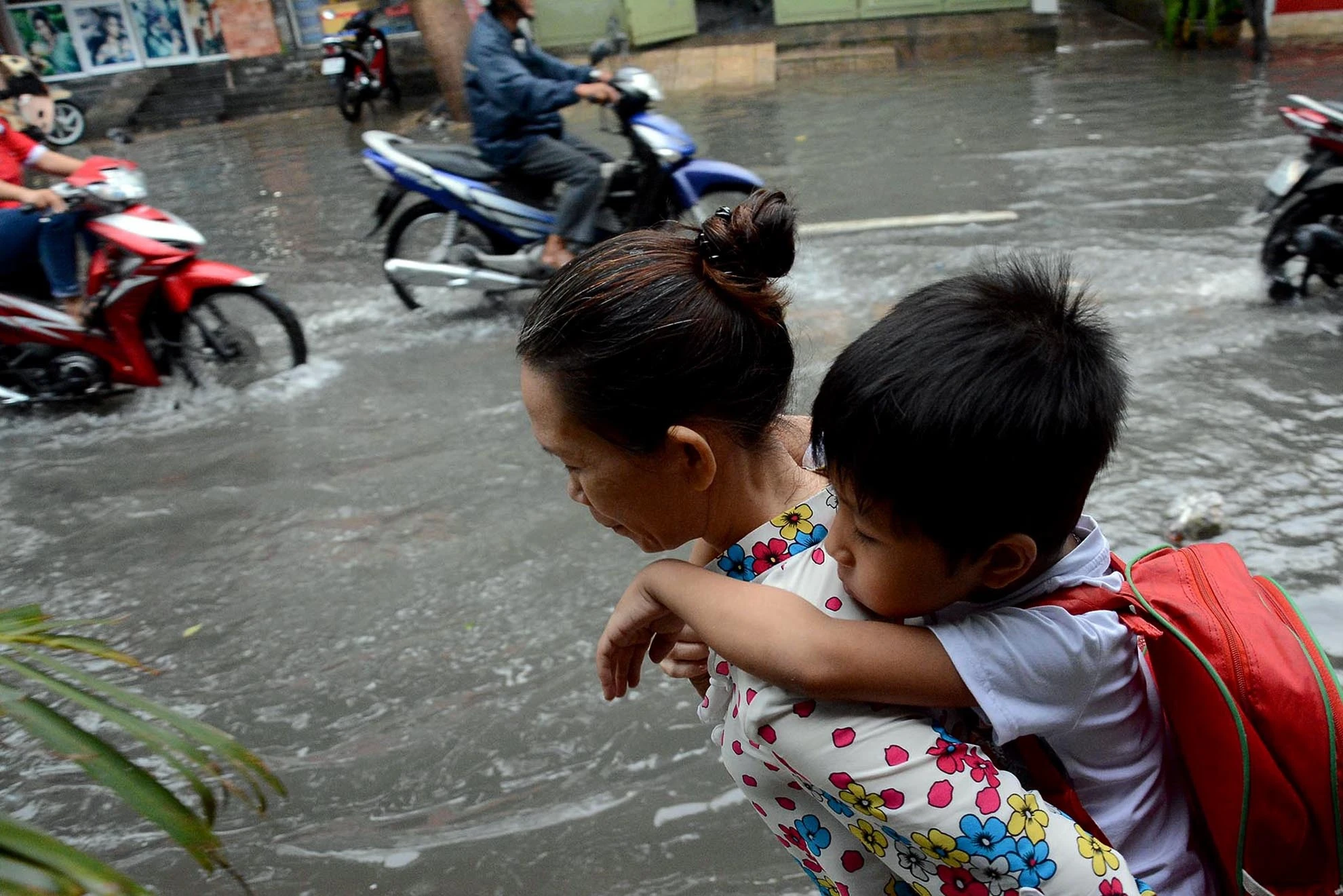 | Nhiều em lớn vẫn phải ngồi trên lưng bố mẹ qua nhiều đoạn đường ngập. |
