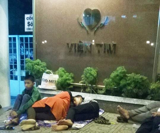 Tại Viện Tim TP.HCM, nhiều người cũng có mặt lấy số thứ tự từ 3h sáng. Vì viện có quy định không cho người dân vào bên trong đợi, nên khi lấy số xong họ trải bao nylon, chiếu nằm ngủ ngay cổng.