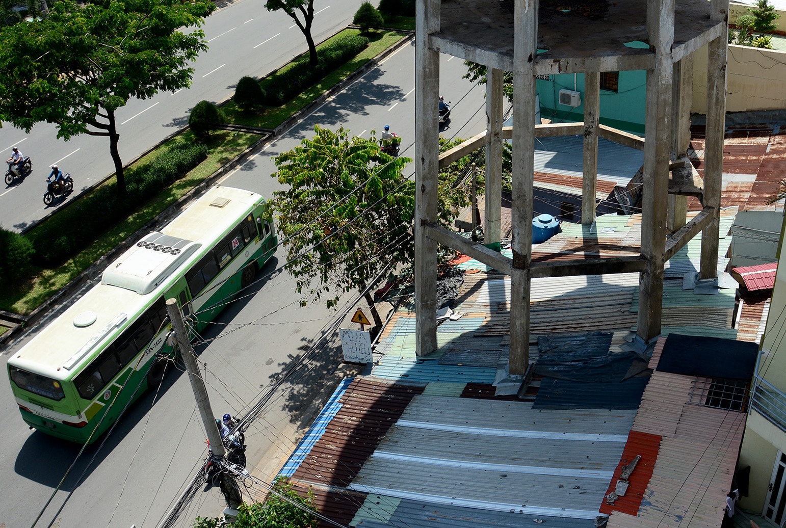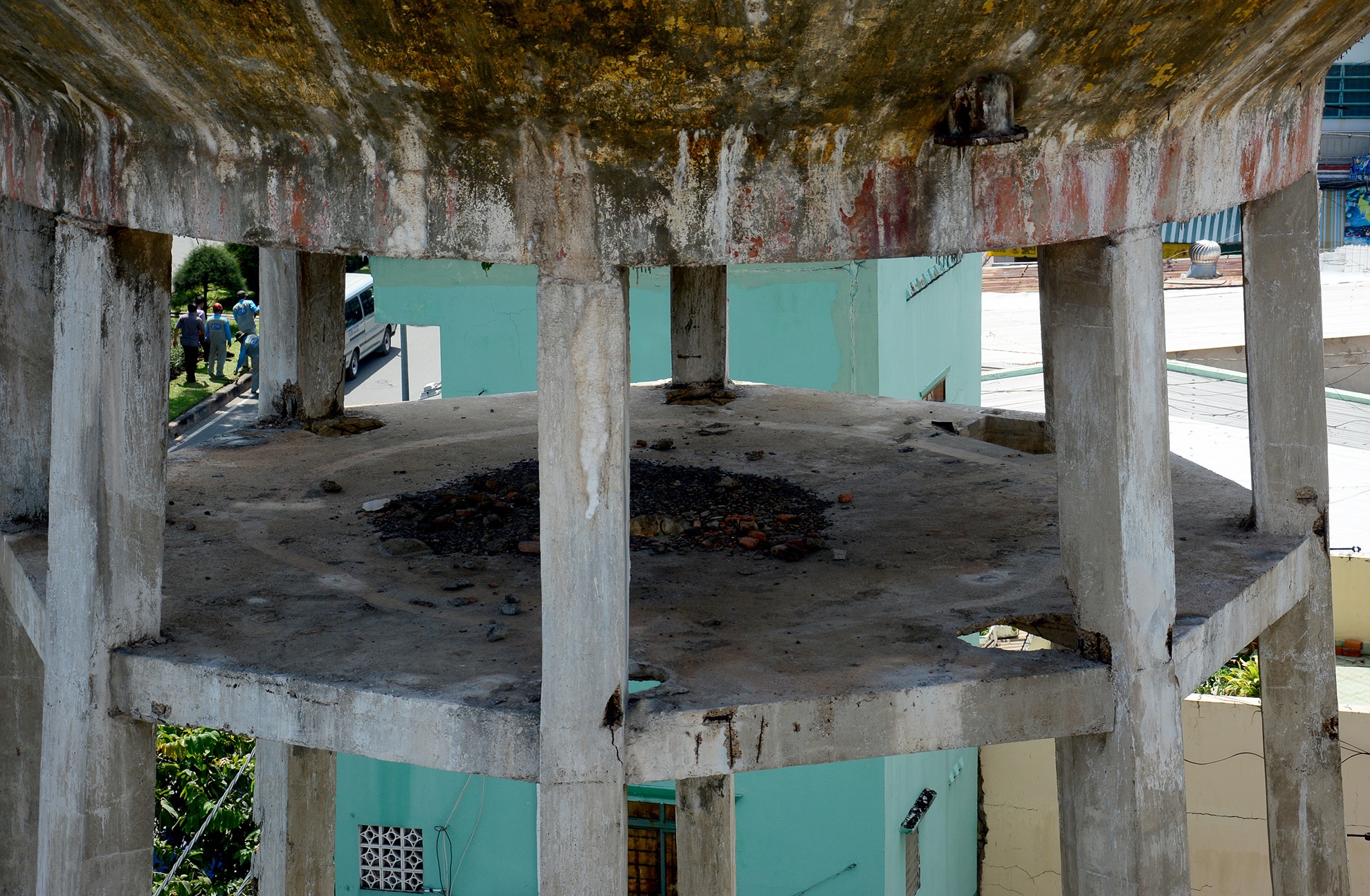 | Được biết, khoảng hơn 10 năm trước, một đơn vị tiến hành tháo dỡ một số chi tiết như ống nước, thang leo... Tuy nhiên, họ lại không tiếp tục phá bỏ toàn bộ. Ngay sau đó, dưới chân tháp mọc lên một vựa ve chai và tiệm sửa xe. Và tháp nước tiếp tục nằm nguyên trạng từ đó cho đến nay. |