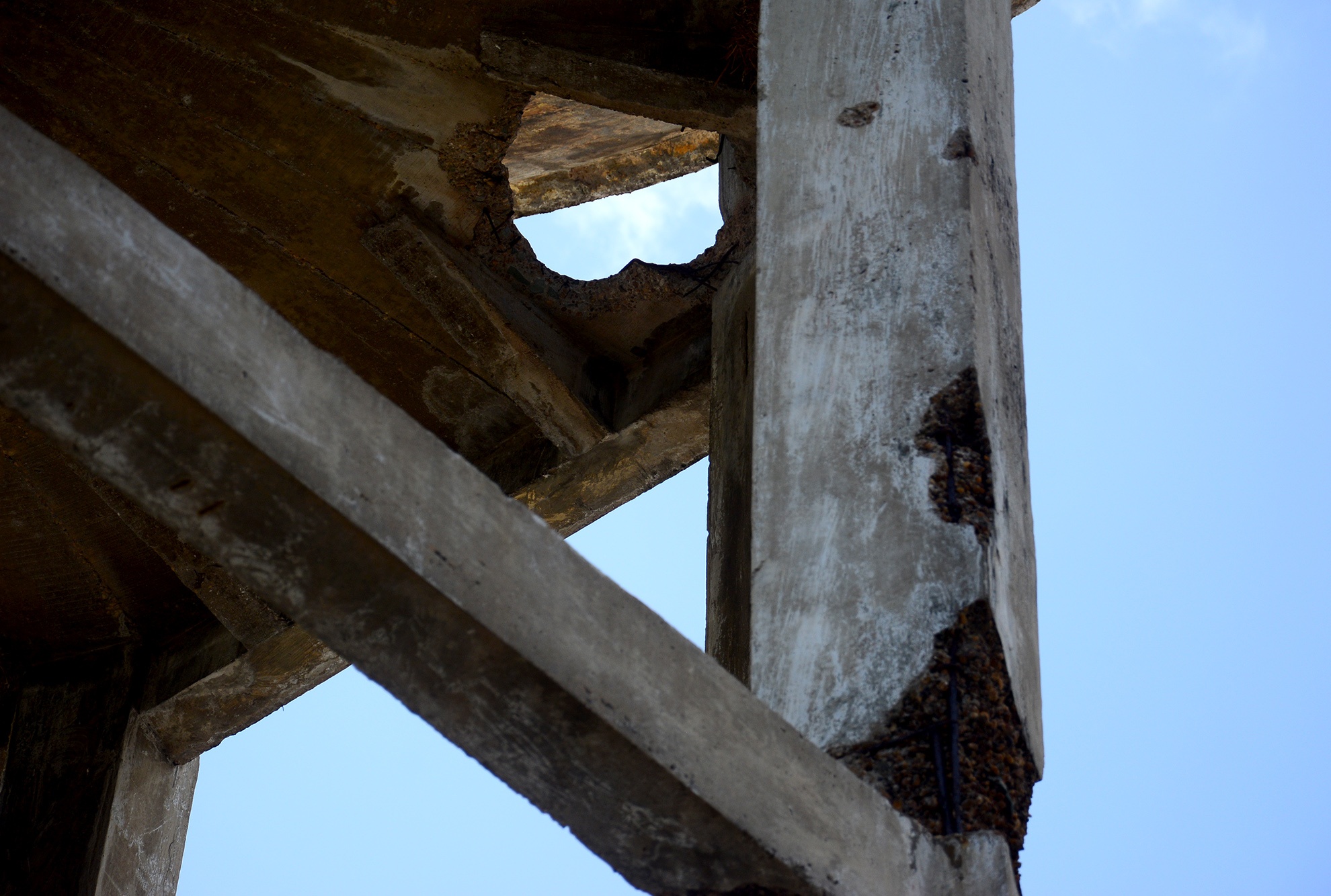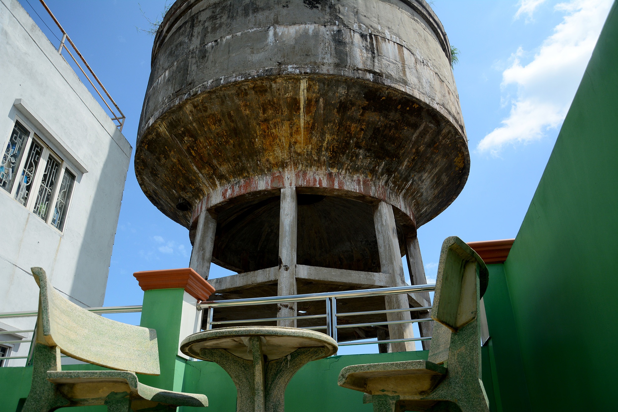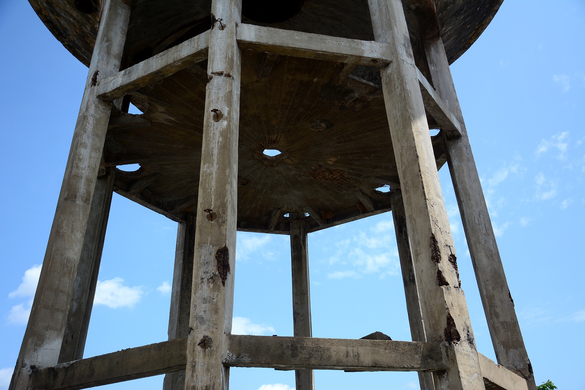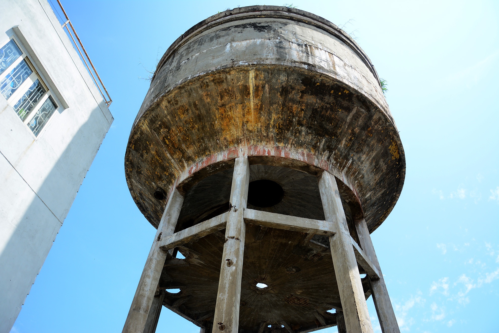 | Do được xây dựng và sử dụng đã lâu, trải qua sự bào mòn của thời tiết, một số mảng tường của bể tháp bị rơi vữa, lộ ra những thanh sắt gỉ và vô số vết trám xung quanh. |