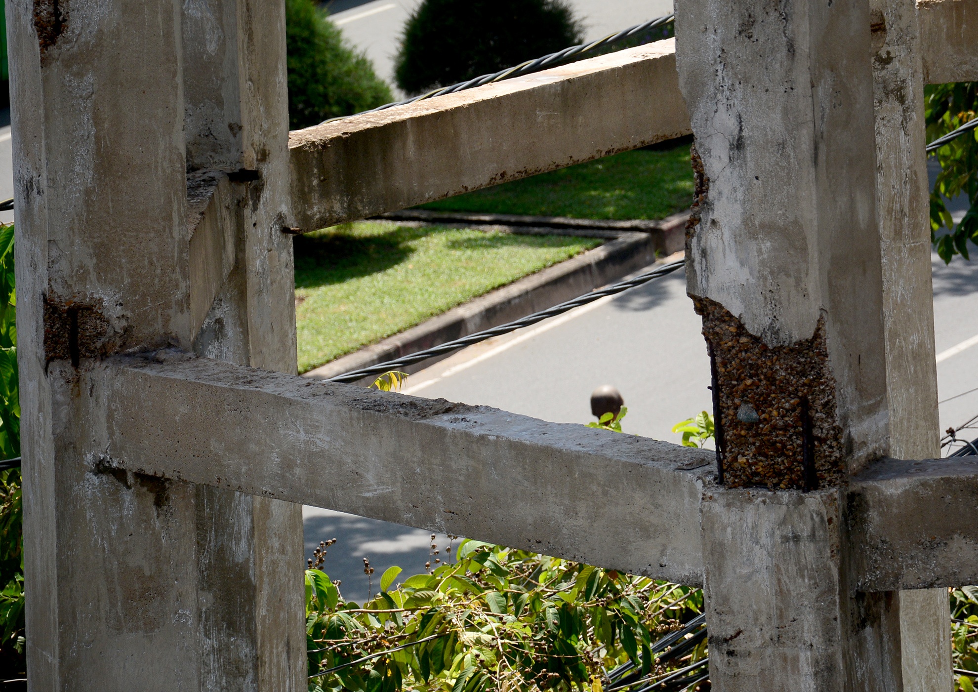 | 8 chân cùng các thanh giằng đều bị nứt nhiều chỗ, lòi kết cấu bê tông và sắt gỉ. |
