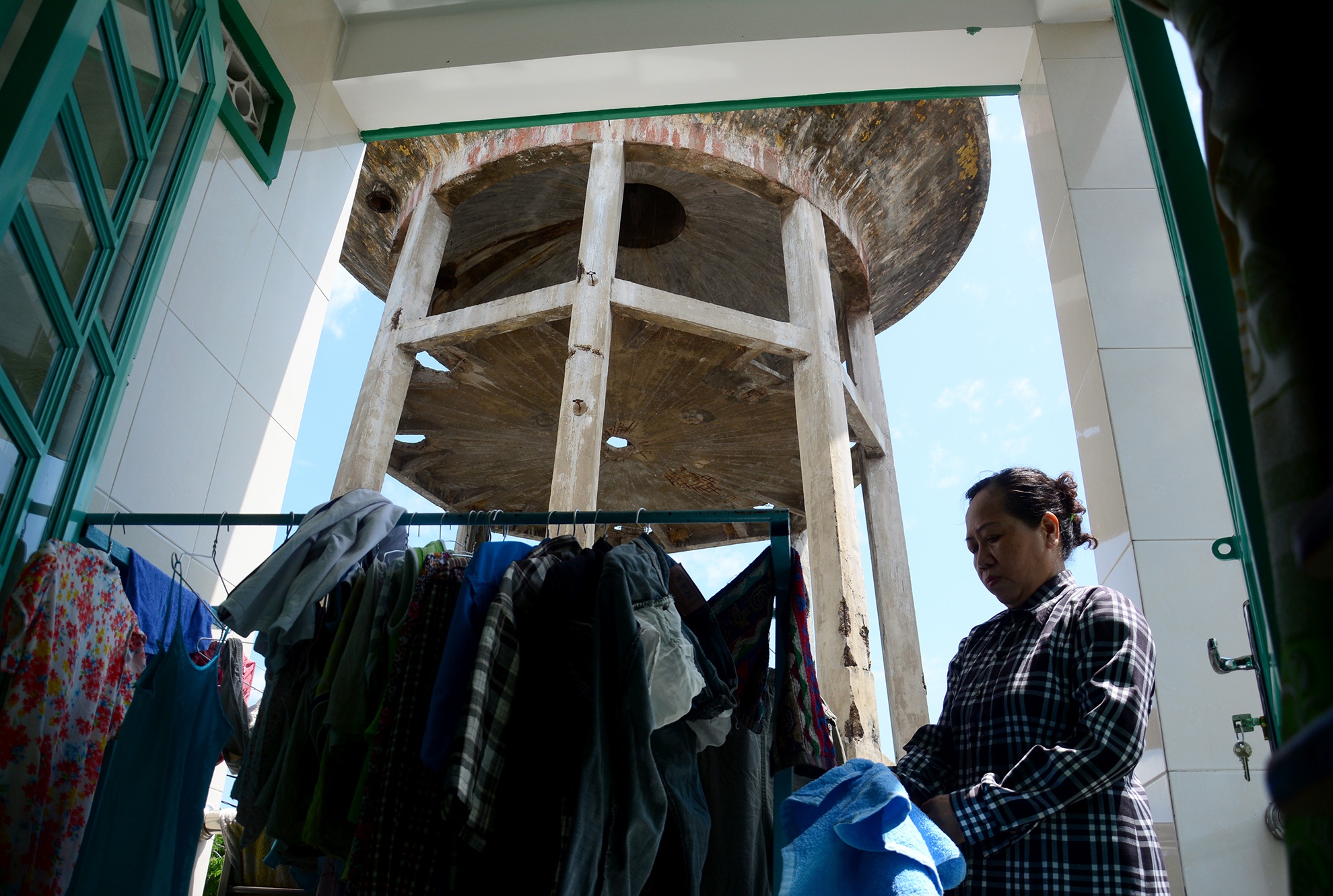 | Sân thượng tầng 2 của nhà ông Rớt được xây dựng cách trụ tháp khoảng gần 10 m nhưng nhìn lên phần bể nước có thể thấy khối bê tông này khá đồ sộ. "Nó có khả năng đe doạ ngôi nhà và những người đang sinh sống nơi đây nếu xảy ra sự cố", ông Rớt nói. |