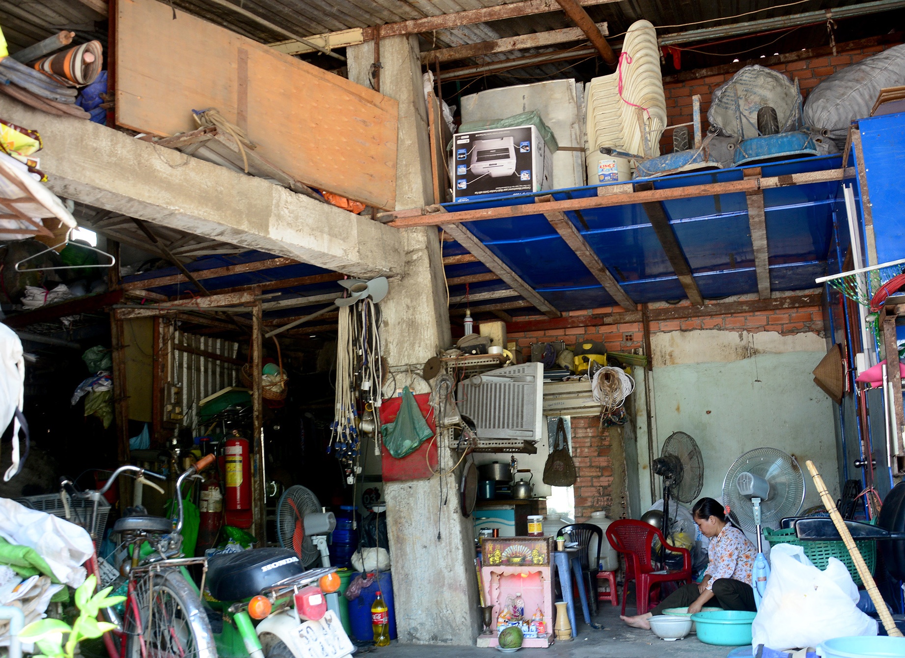 | Dưới chân tháp là vựa ve chai của vợ chồng chị Phạm Thị Hải (quê Nam Định) thuê làm ăn đã hơn 10 năm nay. "Ở và làm ngay dưới chân tháp này chúng tôi cũng thấp thỏm lắm chứ. Người thân, bạn bè, khách lần đầu vào cũng đều cảm thấy lo sợ. Họ khuyên chúng tôi dời đi vì thấy quá nguy hiểm nhưng do điều kiện nên phải liều ở thôi, chờ khi nào đập thì chuyển luôn", người phụ nữ chia sẻ. |