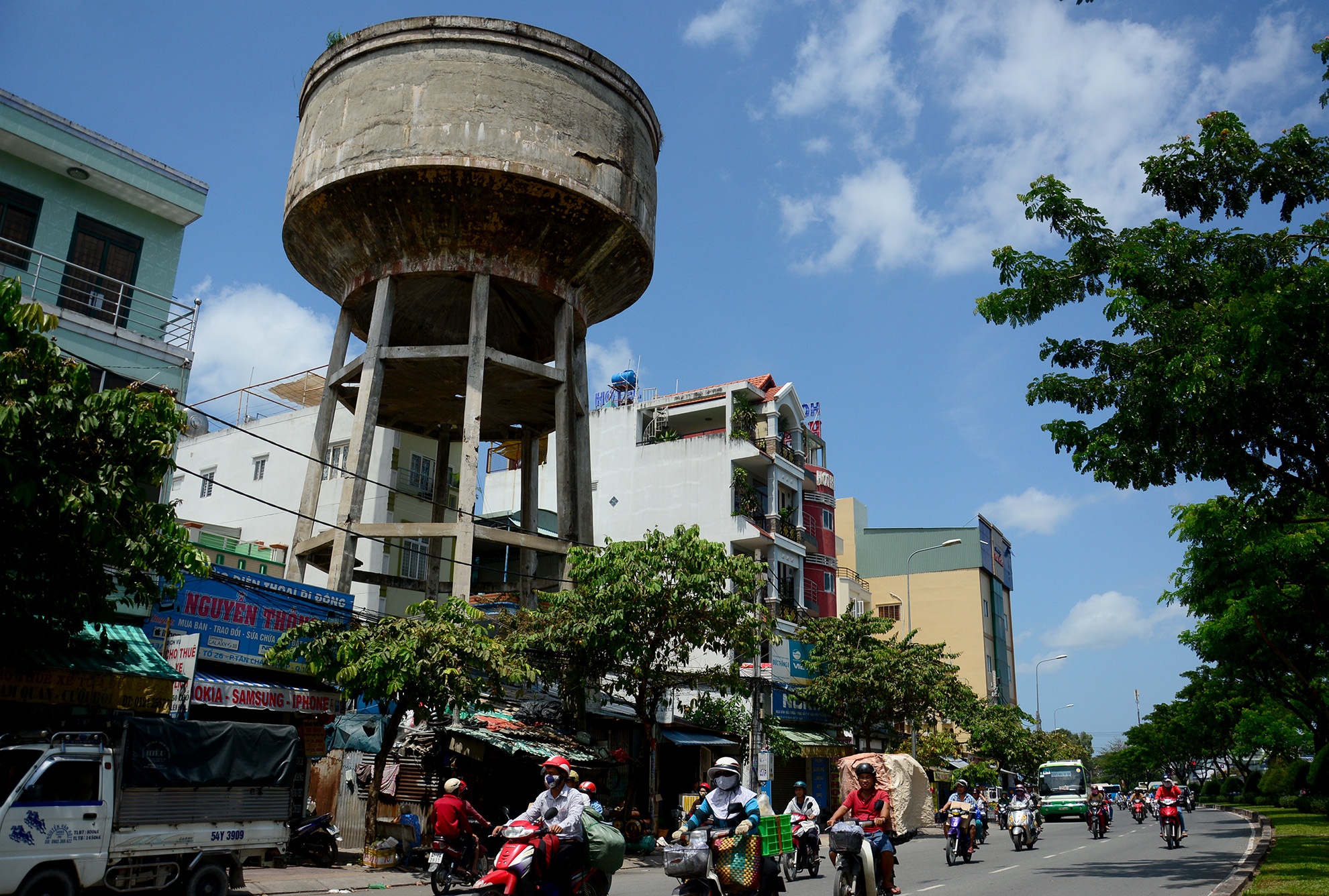 Trong số gần 100 thủy đài ở TP HCM có nhiều chiếc được xây dựng từ thời Pháp và trước năm 1975. Hiện các tháp nước này bị bỏ quên hàng chục năm qua, hư hỏng nặng, có nguy cơ sập đổ sập bất cứ lúc nào. Trong ảnh là thủy đài khổng lồ tại khu dân cư bên tuyến đường Tô Ký (phường Trung Mỹ Tây, quận 12).