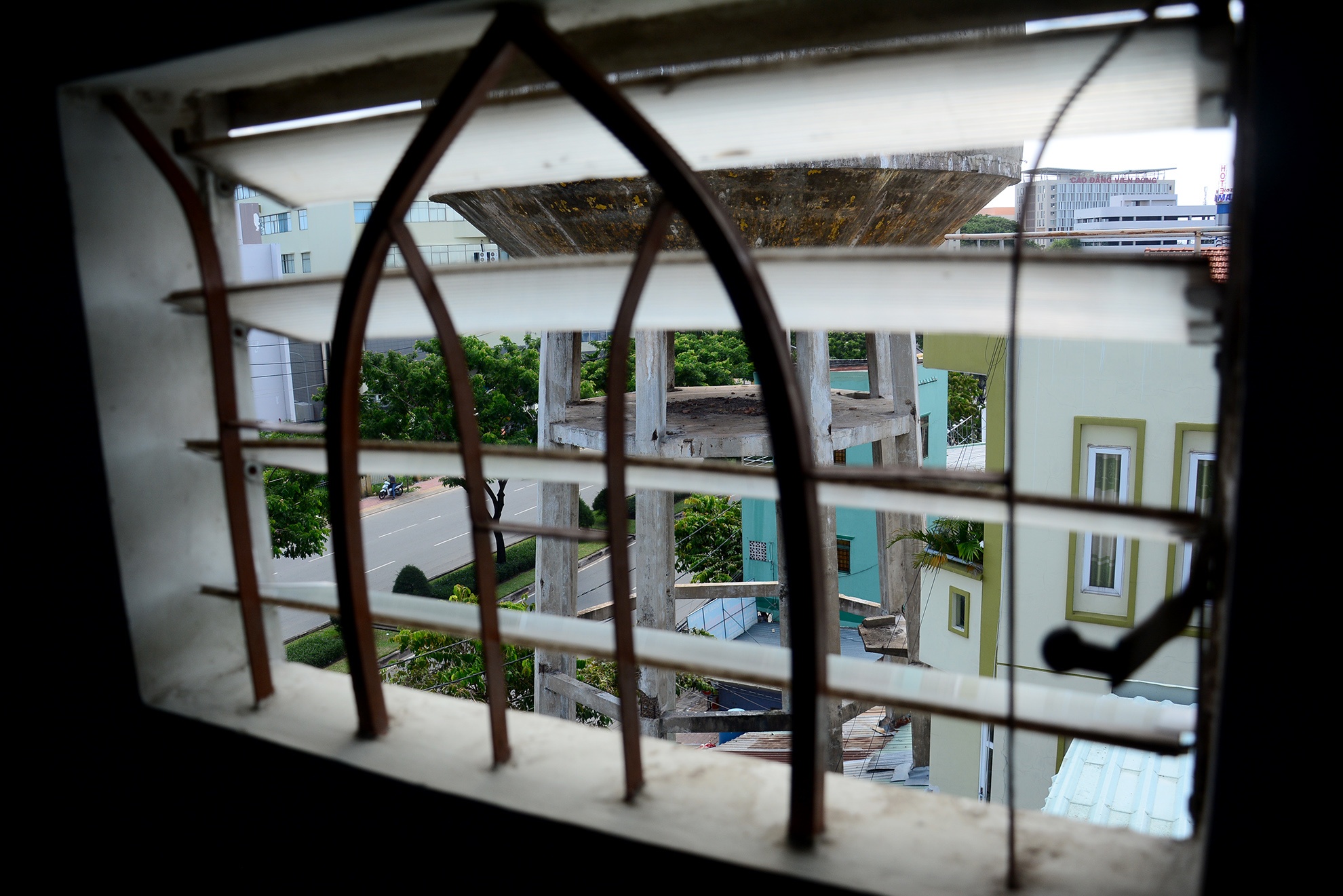 | Từ cửa sổ của một số ngôi nhà xung quanh, có thể thấy toàn bộ tháp nước nằm sát bên cạnh. |