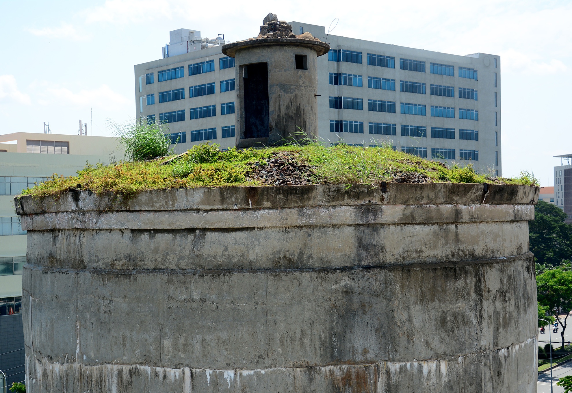 Trên nóc thuỷ đài bị phủ lớp đất dày, cỏ mọc xanh rờn.