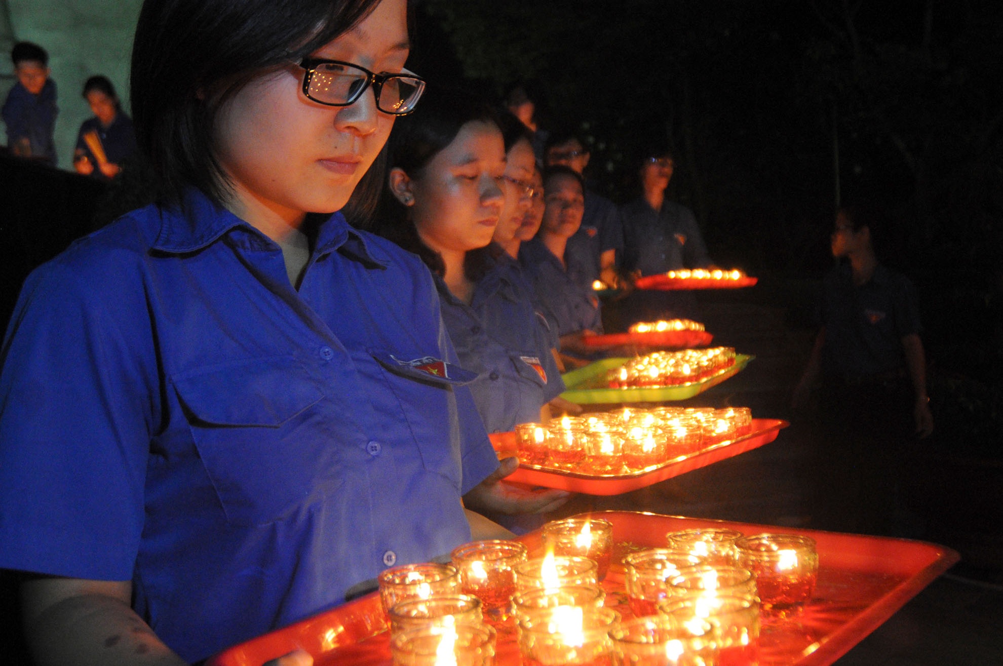 | Trước đó, hàng trăm bạn sinh viên đến từ các trường CĐ, ĐH có mặt rất sớm để chuẩn bị nến và sửa sang lại những ngôi mộ. Bạn Nguyễn Bích Thủy (sinh viên CĐ Vianatex) cho biết: "Đây là hoạt động rất ý nghĩa. Em tham gia ngày lễ với mong muốn tri ân các anh hùng liệt sĩ đã hy sinh cho Tổ quốc". |