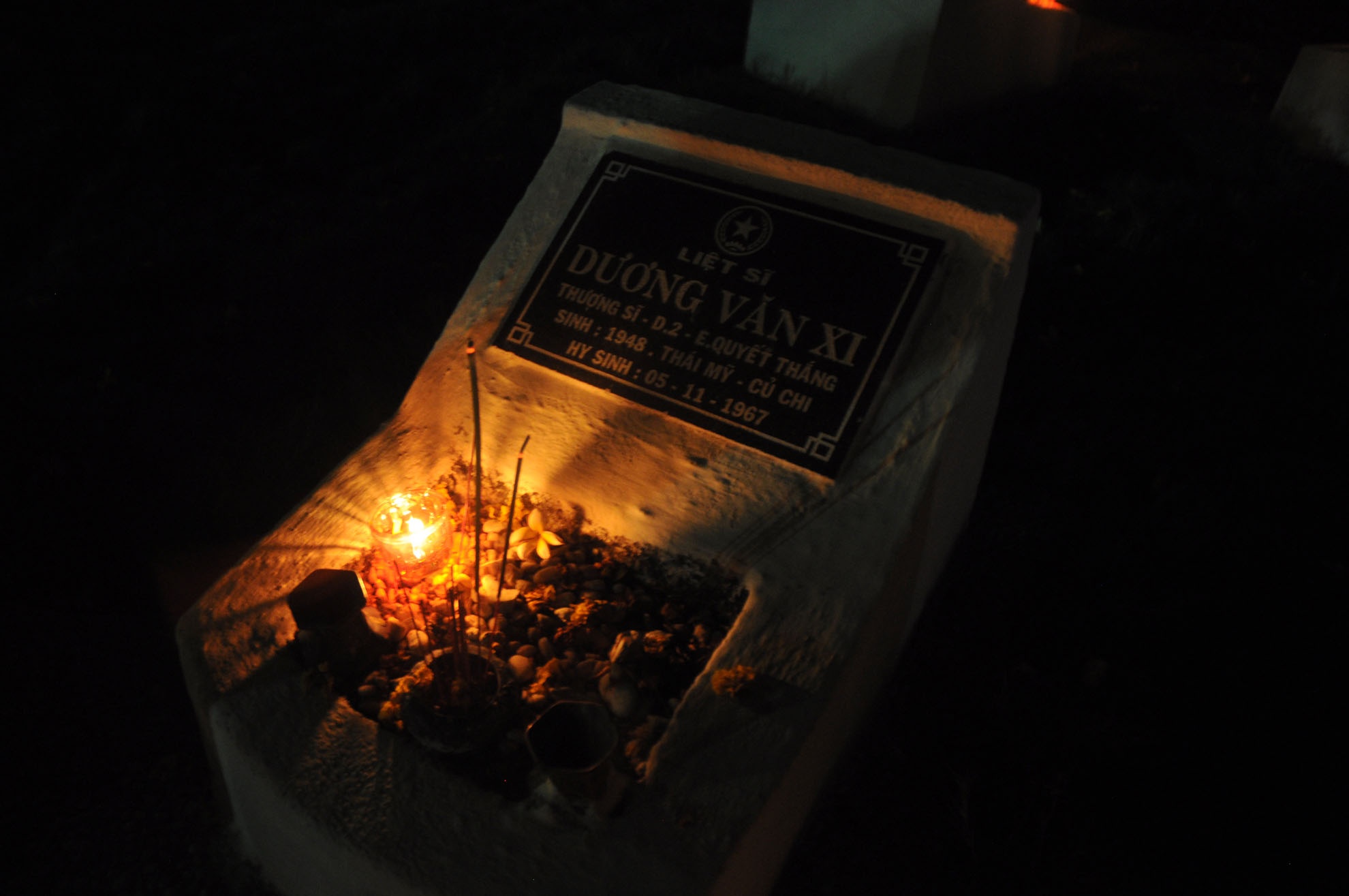 | Những ngôi mộ của các chiến sĩ đã ngã xuống sáng lên trong đêm. |