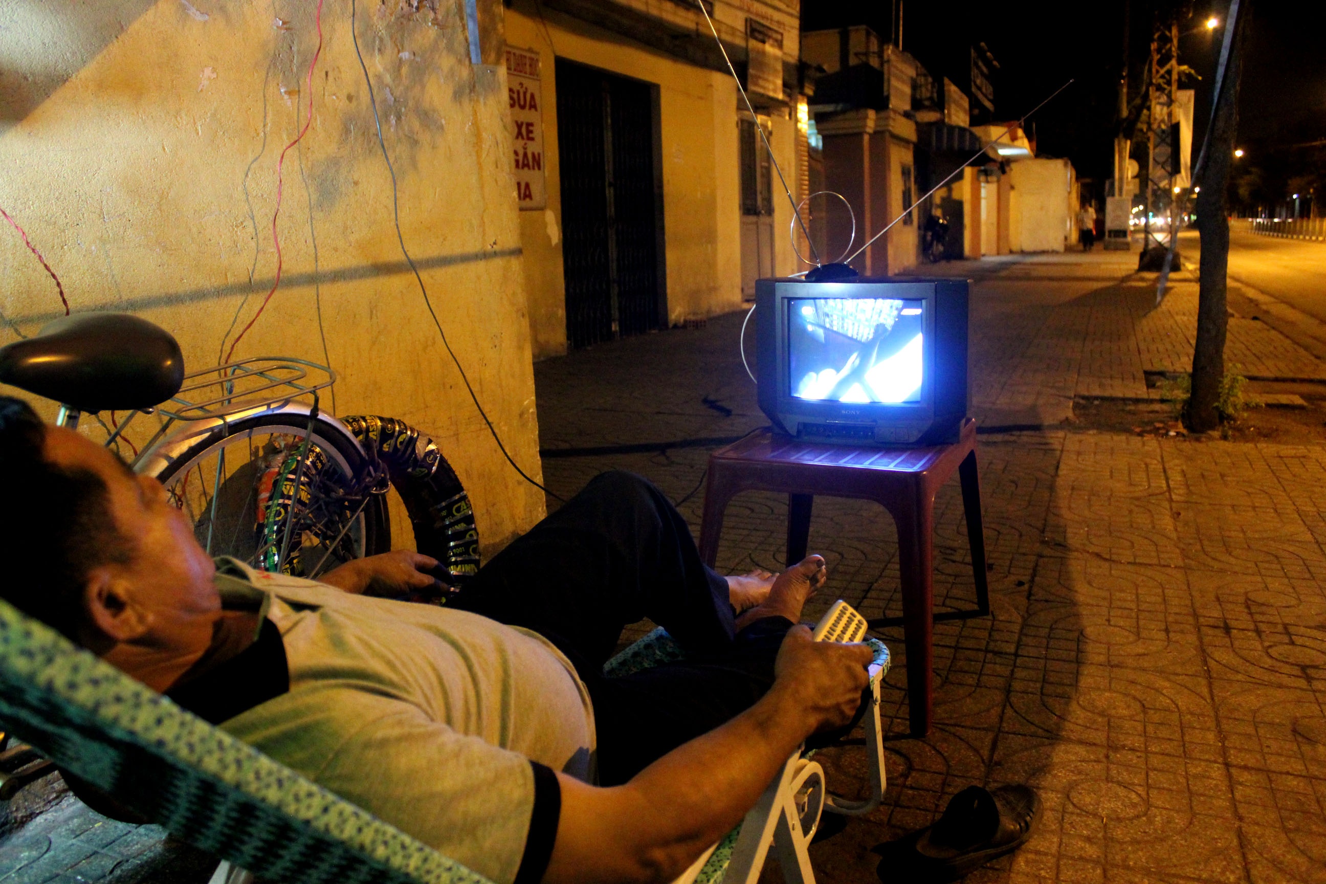 | Trên vỉa hè đường Trường Chinh, quận Tân Bình, ông Sơn (trú quận Tân Bình) mang chiếc tivi cũ ra vừa xem bóng đá vừa bơm vá khi có khách. Ông Sơn chia sẻ: "Những giải như World Cup, Euro, SEA Games tôi thường mang chiếc tivi cũ ra bên đường để vừa xem vừa làm. Là người hâm mộ bóng đá nhưng với sức lực của mình, chỉ có thể xem được những trận hay, đột phá thôi. Trong trận khai mạc này tôi nghĩ Brazil sẽ thắng cách biệt 2 bàn". |