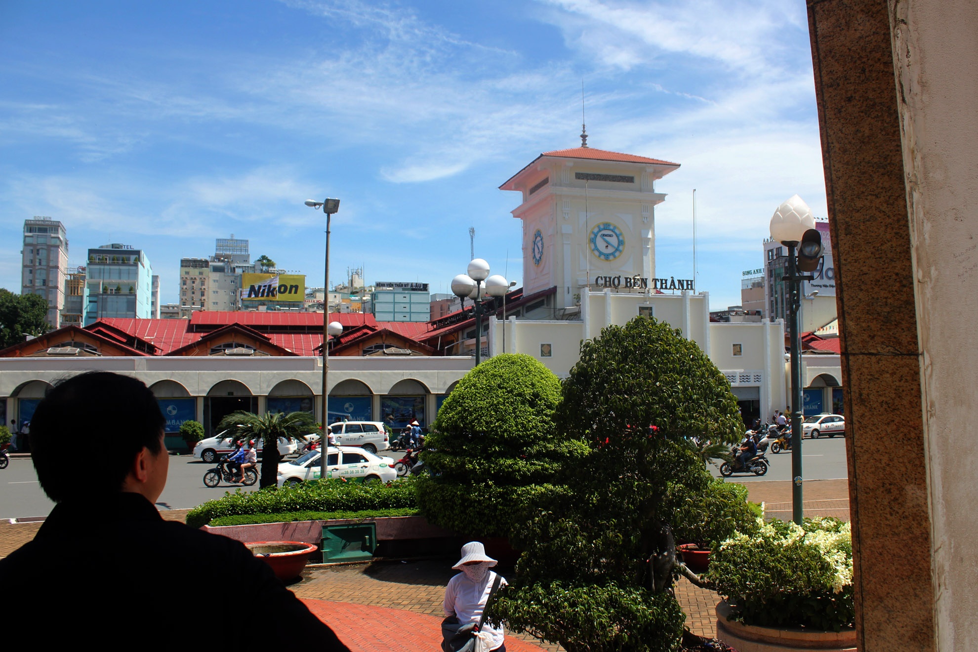 | Một du khách đứng dưới bóng mát của tượng đài Trần Nguyên Hãn nhìn ngắm chợ Bến Thành dưới trời nắng rực. |