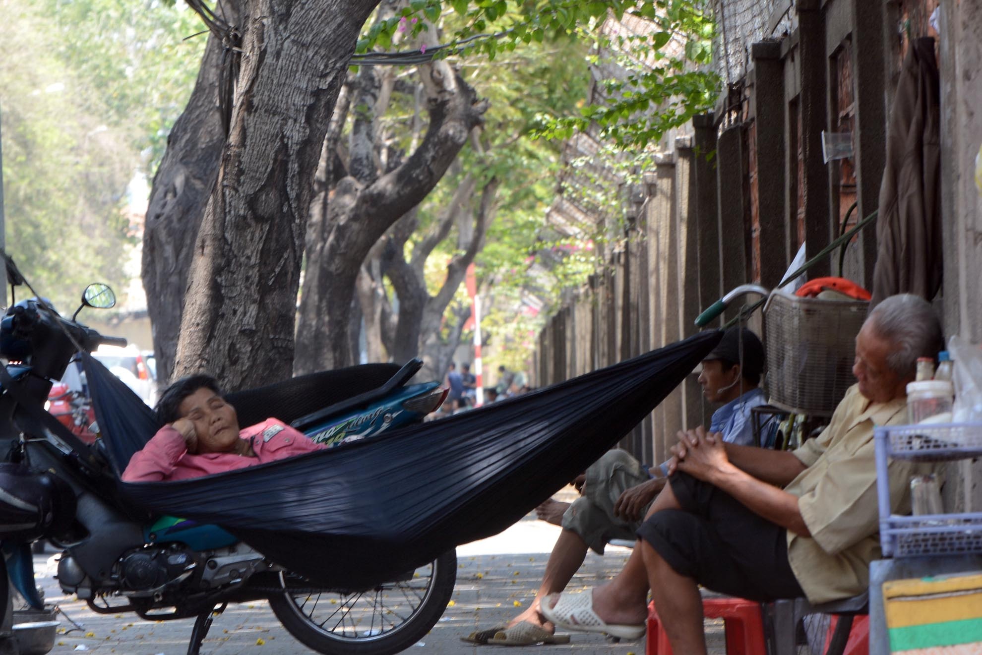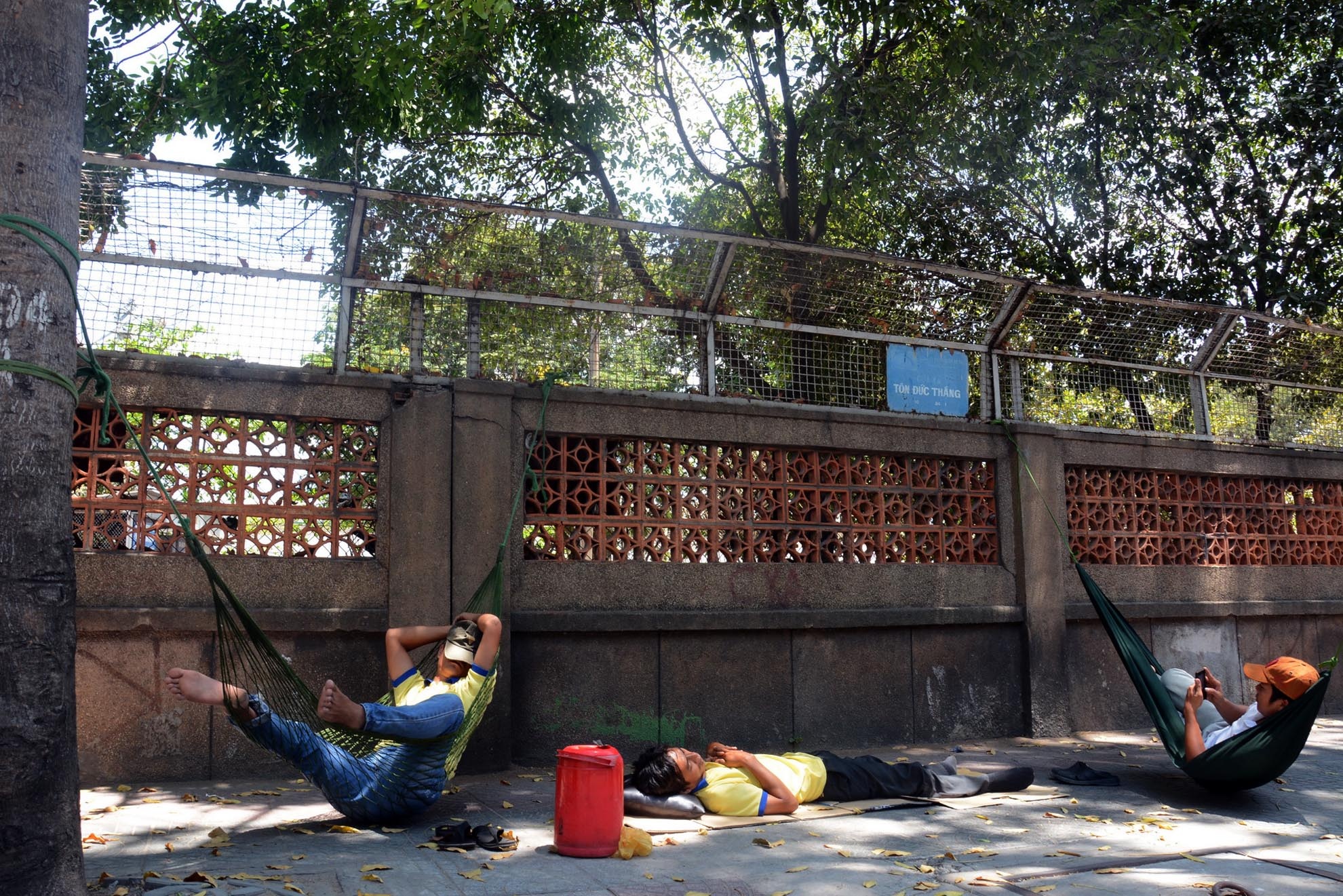 | Các công nhân xây dựng mang theo võng ngủ trưa dưới bóng cây trên đường Tôn Đức Thắng, quận 1. |