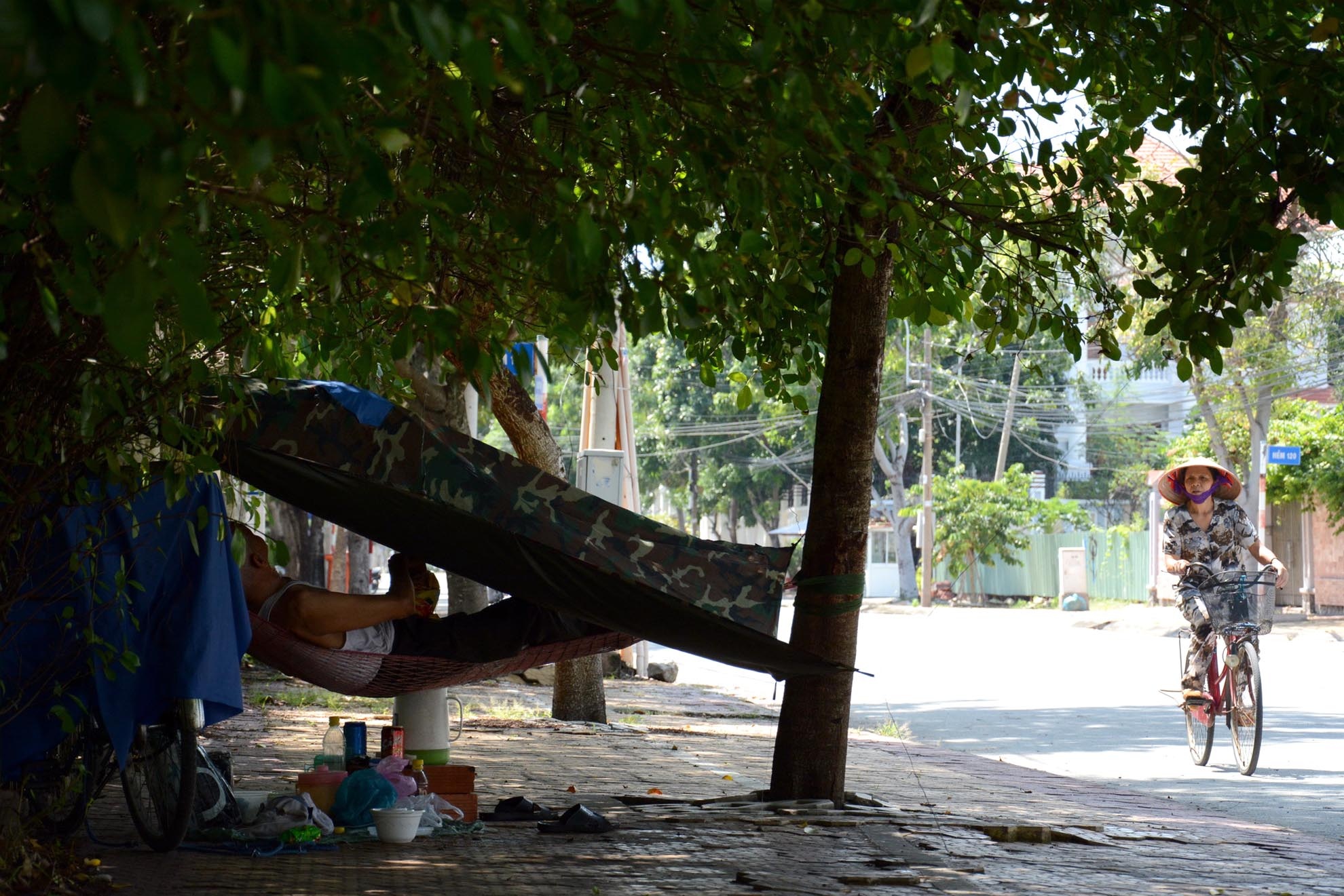 | Phía ngoài mặt đường trời nắng chói chang, một cụ ông mắc võng dưới cây, che bạt nằm nghỉ bên đường Xuân Thủy, phường Thảo Điền, quận 2. |