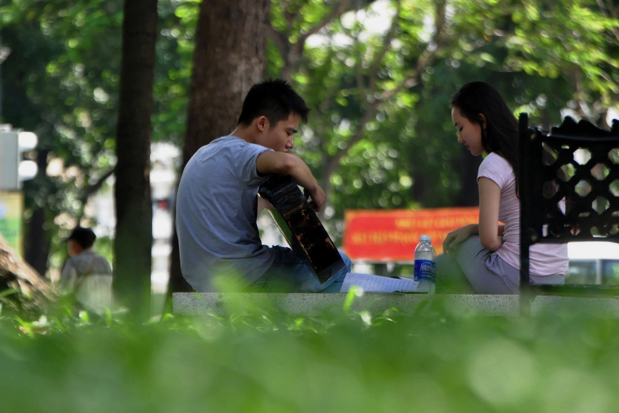 Các công viên với nhiều cây xanh, mát mẻ là nơi lý tưởng để người dân, đặc biệt là giới trẻ lui tới trong những ngày nắng nóng này. Bạn Thu Thủy, sinh viên trường ĐH KHXH & NV TP HCM cho biết, trời nóng bức, phòng trọ của Thủy lại lợp bằng mái tôn nên vào giữa trưa và đầu giờ chiều, căn phòng như lò thiêu. Vì thế, sau các tiết học buổi sáng, Thủy đành phải ghé vào công viên 30/4, quận 1 để vừa "trốn" nóng vừa ôn bài và vui chơi với mấy người bạn.