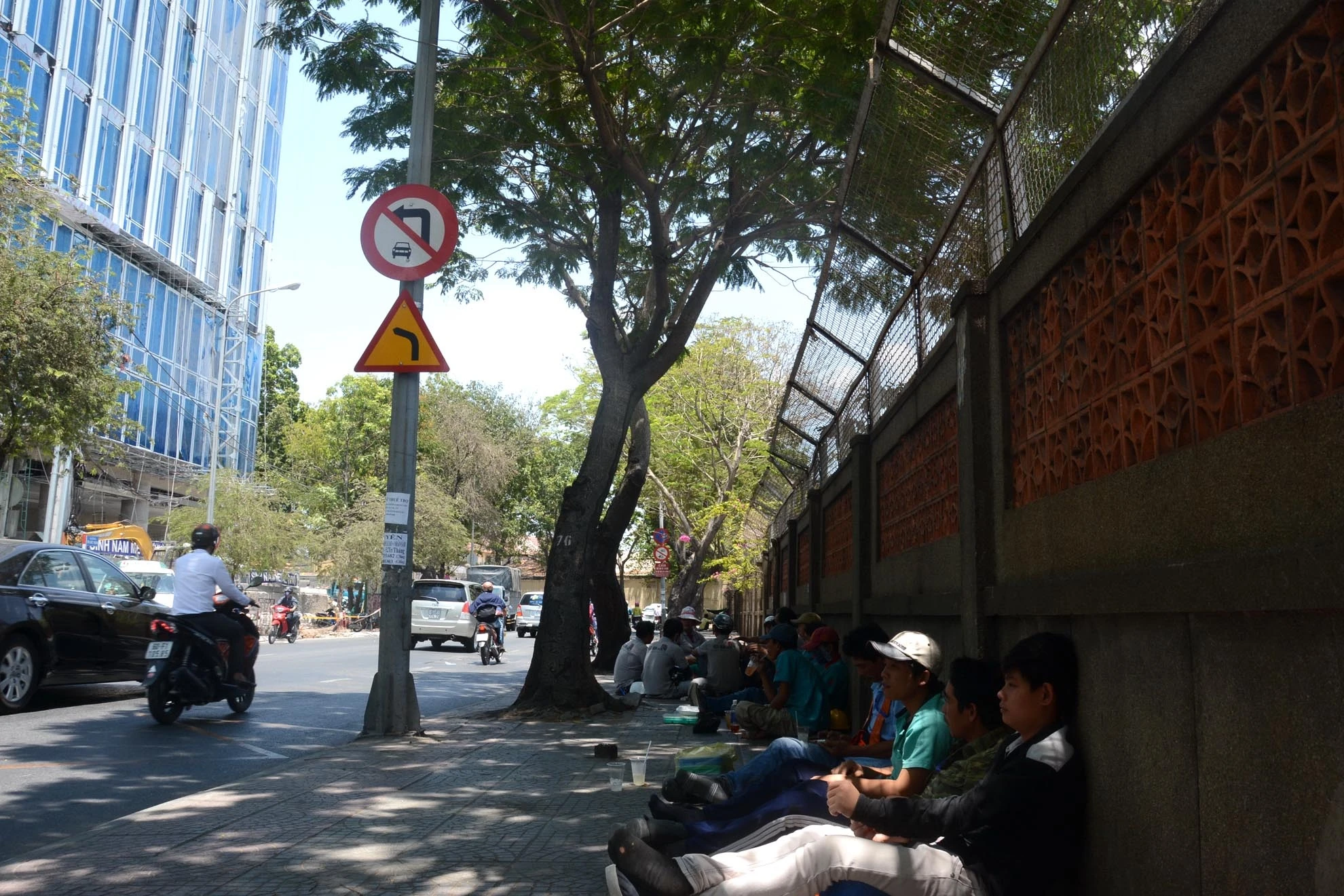 | Hàng chục công nhân xây dựng tận hưởng bóng mát của những cây điệp bên đường Tôn Đức Thắng, quận 1. Một số công nhân cho biết, cả buổi sáng làm việc trên công trường rất nóng bức, giờ giải lao giữa trưa họ qua bên đường có cây xanh thoáng mát để vừa tiện ăn cơm vừa tranh thủ nghỉ ngơi chờ buổi làm việc chiều. |