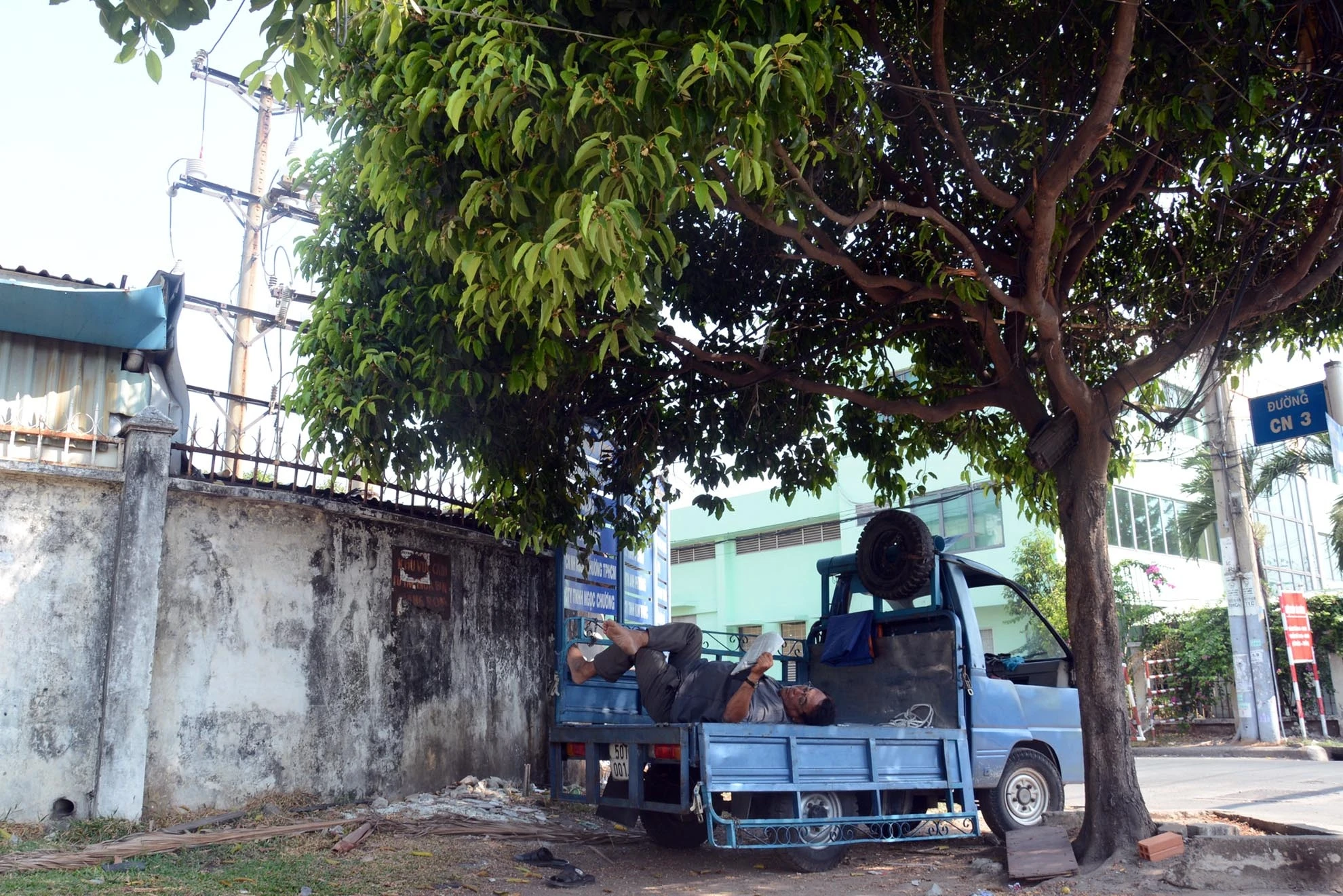 | Tài xế xe tải nằm chờ khách hàng dưới bóng mát của một cây xanh chừng 5 năm tuổi trên đường CN3, quận Tân Phú. |