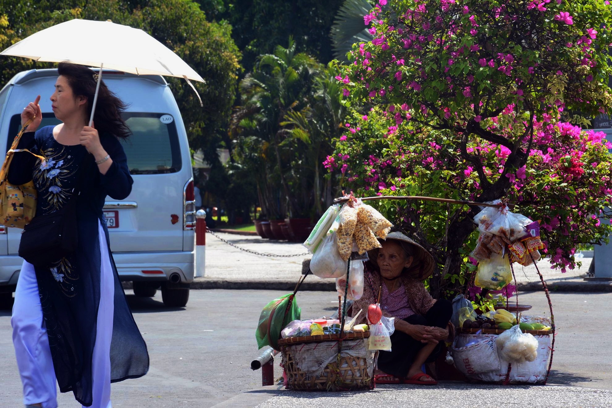 | Cụ bà bán hàng rong nấp trong bóng râm nhỏ của cây hoa giấy trong công viên 23/9, trước chợ Bến Thành, quận 1. Thời tiết nắng nóng khiến những người bán hàng rong kiệt sức vì mất nước. |