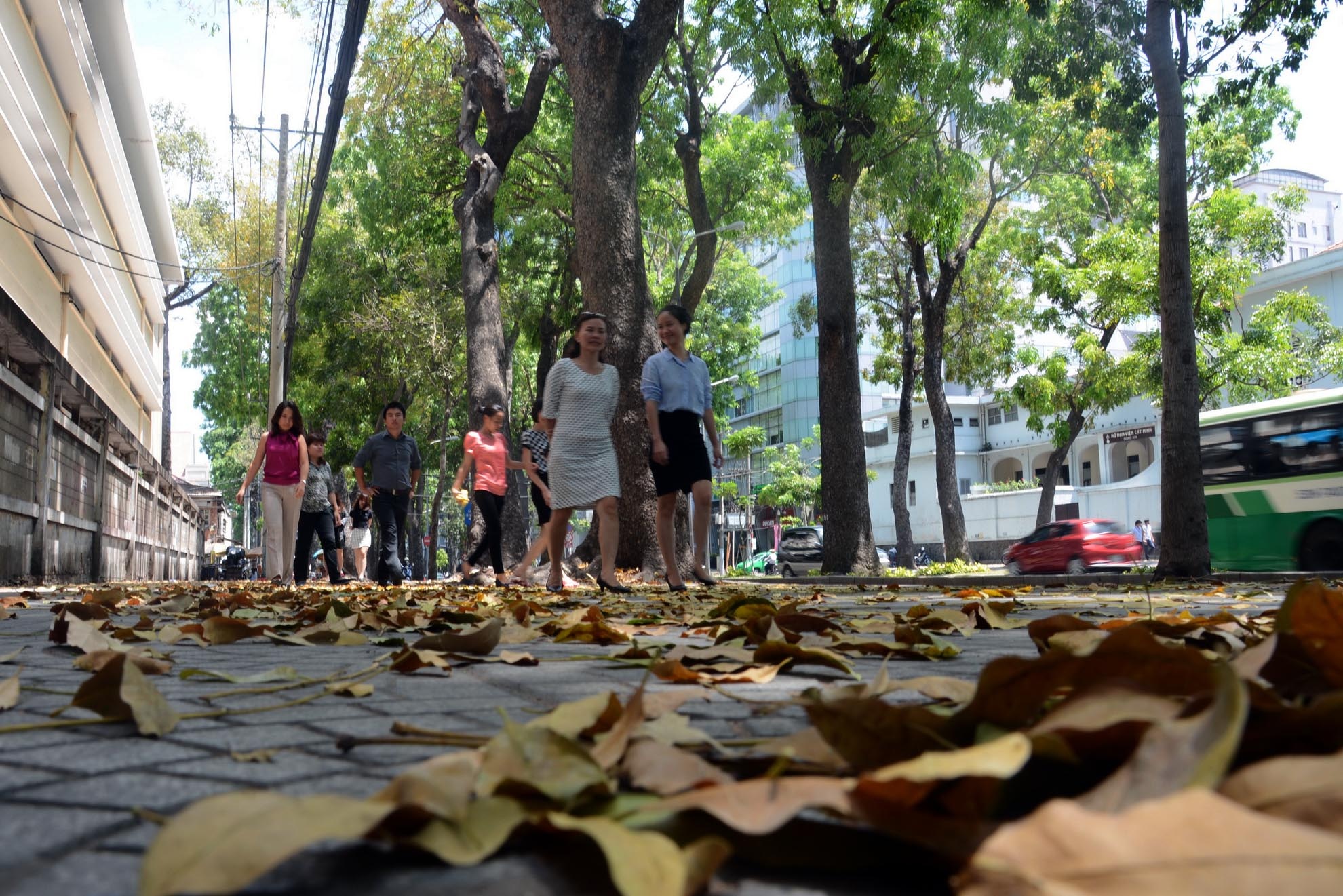 | Dân công sở ở quận 1 rảo bước trên vỉa hè đường Tôn Đức Thắng đầy lá vàng của hàng cây sọ khỉ (xà cừ) cổ thụ tỏa kín mặt đường. |