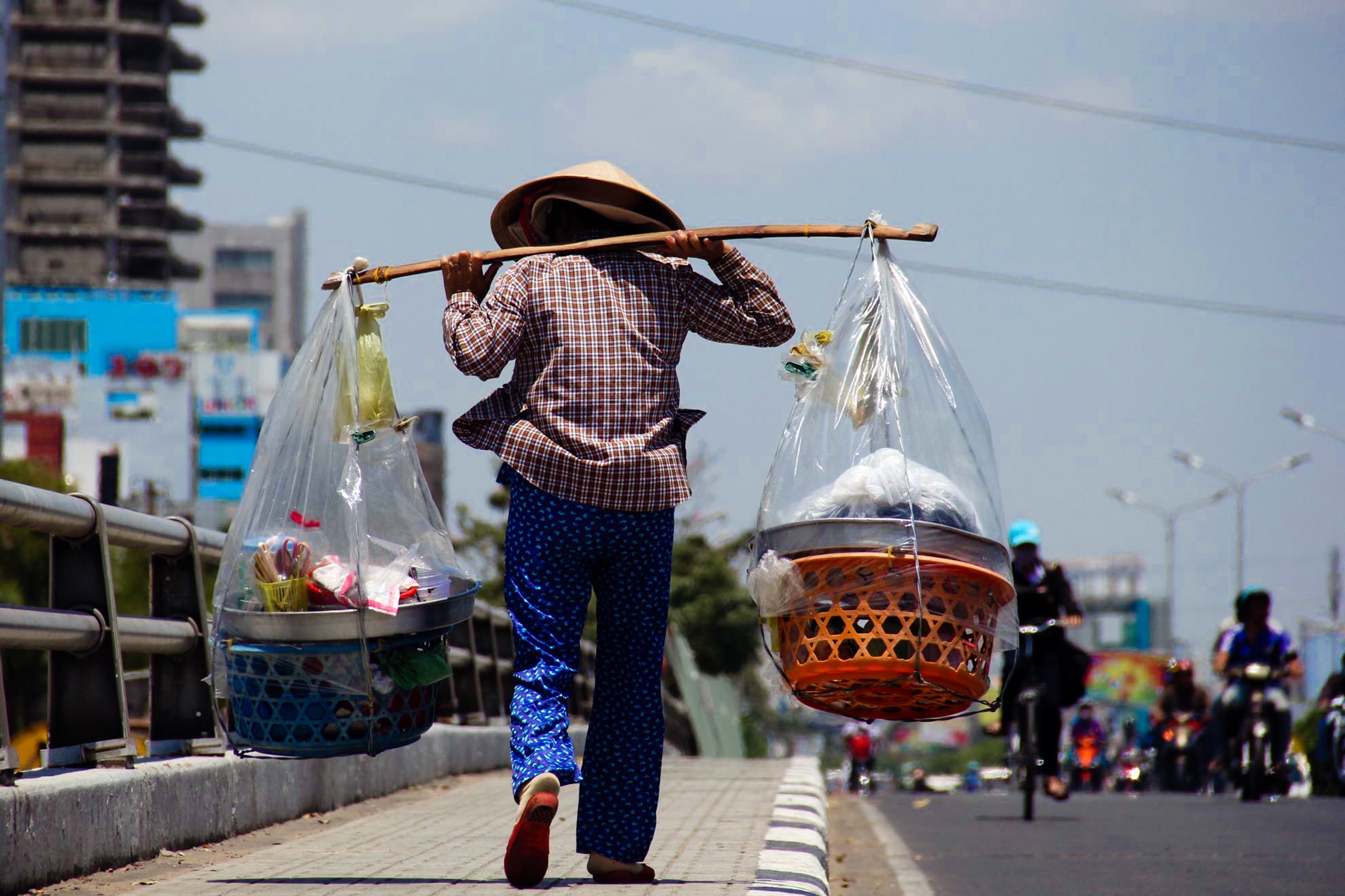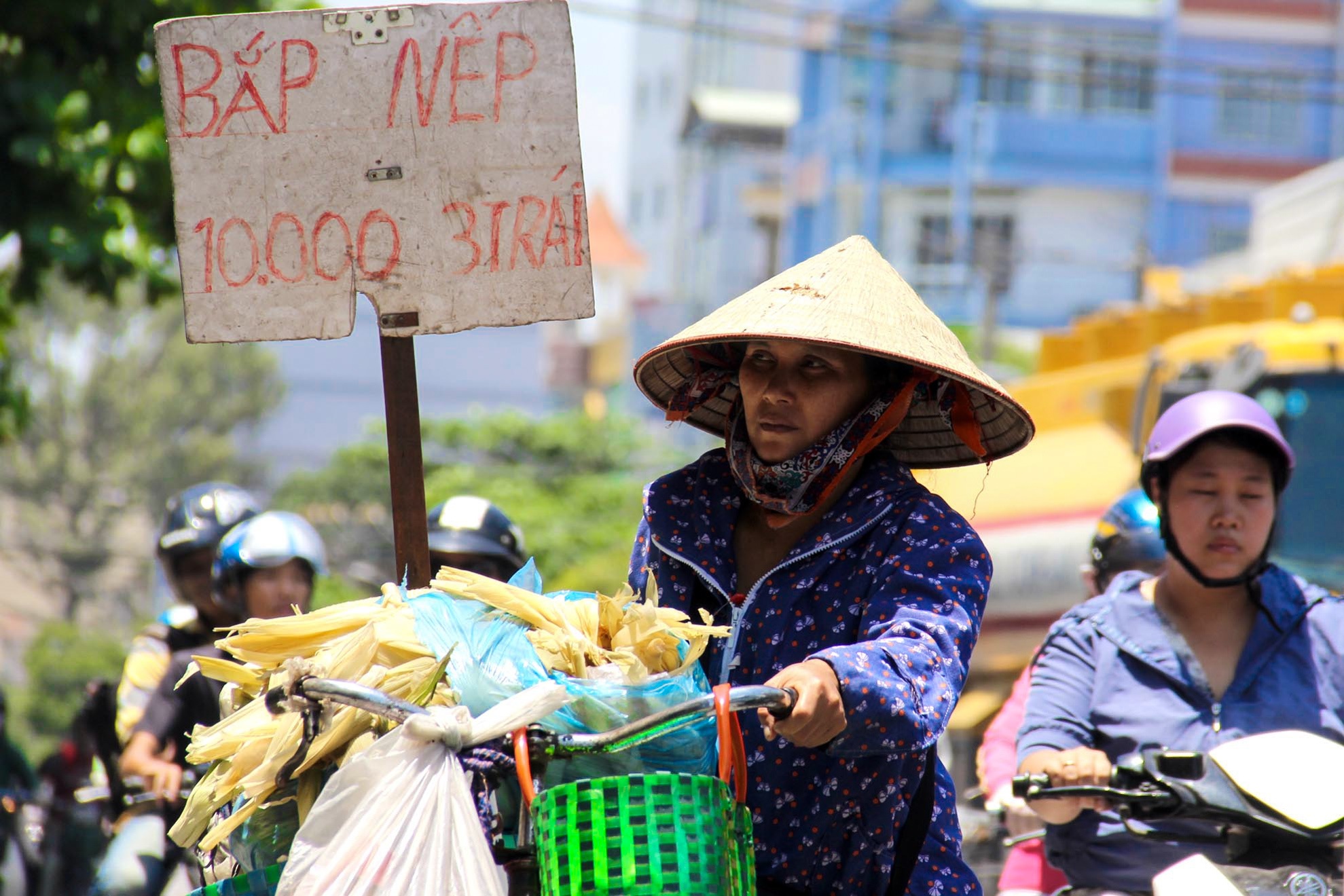 | Trên những cung đường không có nhiều cây xanh, nắng nóng càng gay gắt. Trưa 25/3, người bán hàng rong trong ảnh đang vội vàng đi tìm bóng mát để ngồi bán. |