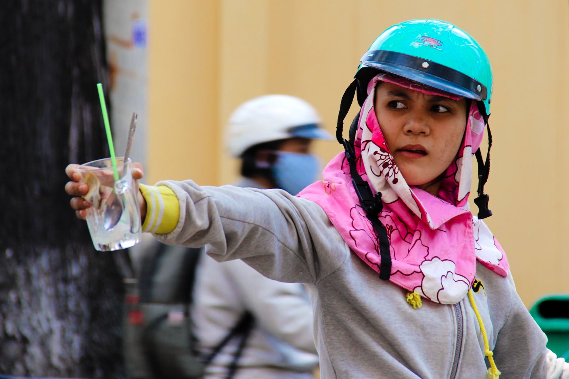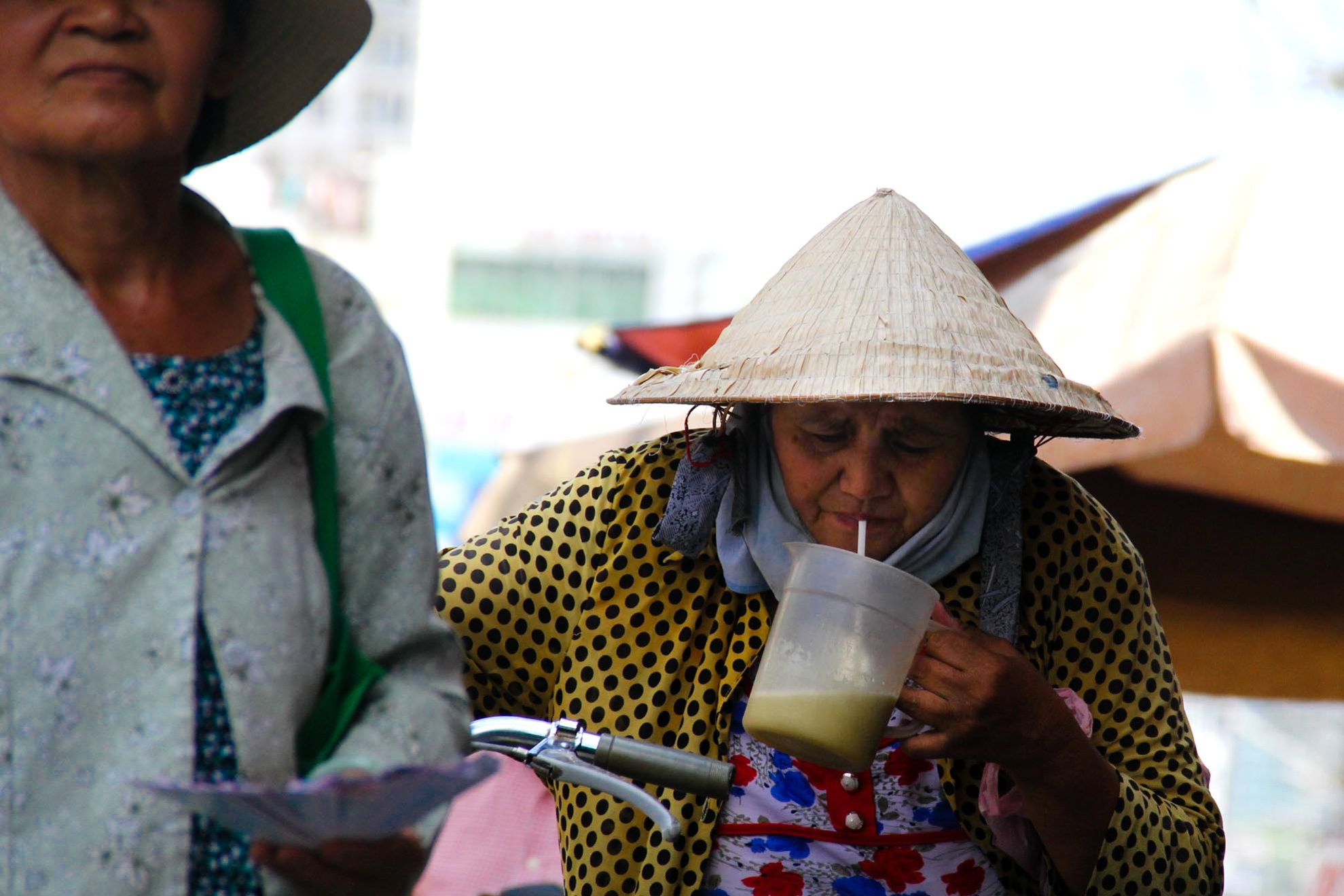 | Bà bán vé số uống vội ca nước mía trước trong cái nóng hầm hập của Sài Gòn. |