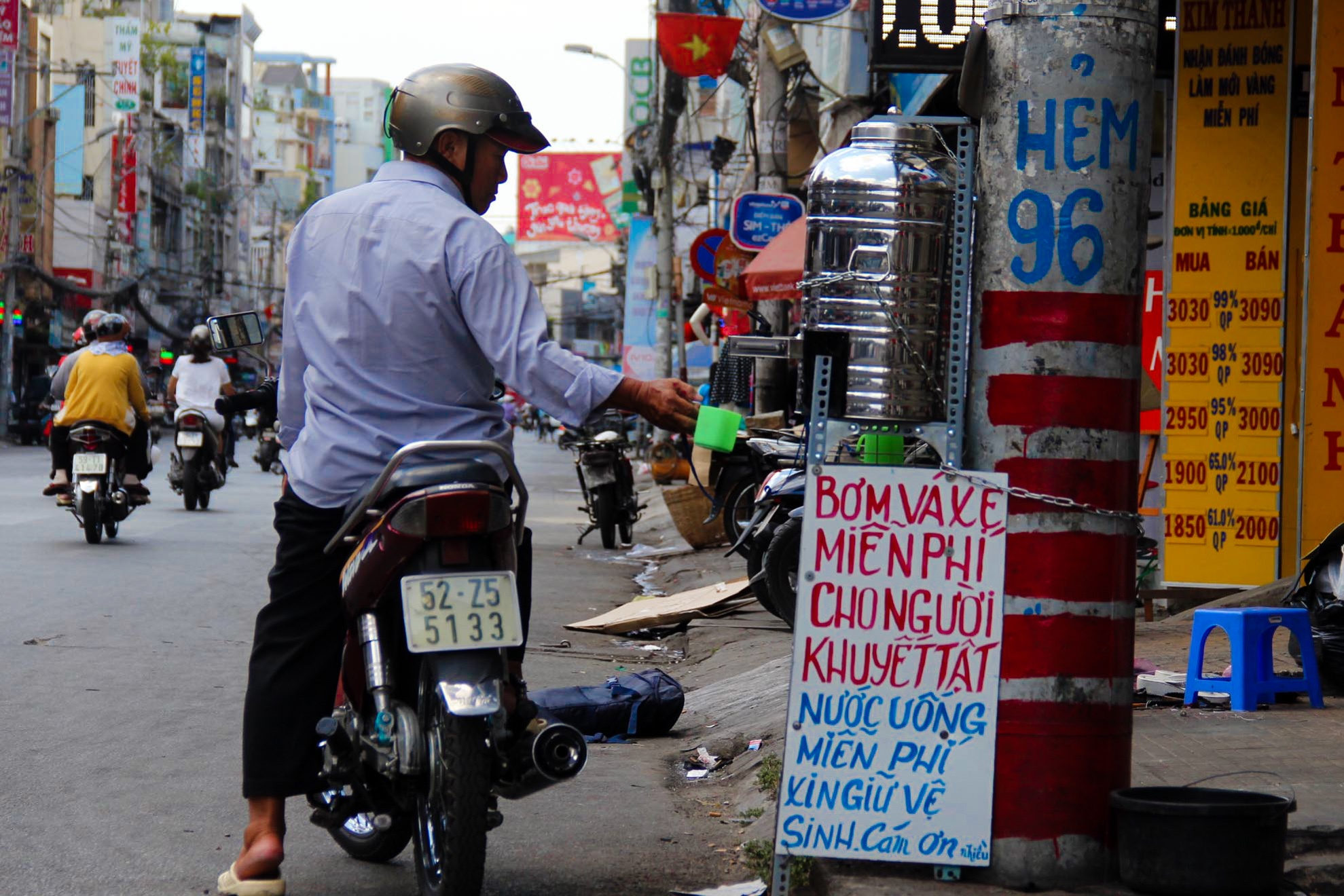 | Người dân trên đường Nguyễn Kiệm (quận Gò Vấp) đặt các thùng nước trà đá miễn phí cho các bác xe ôm, người lao động...dừng chân nghỉ mệt. |