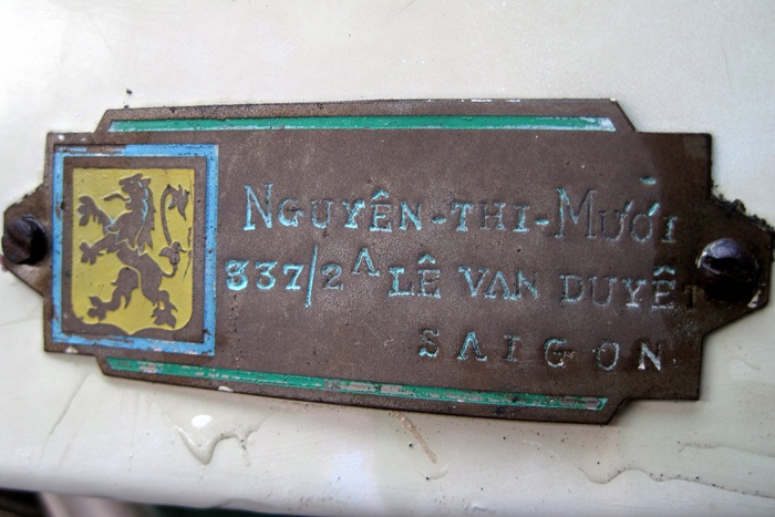 | Thời đó, chủ nhân của xe được khắc tên, địa chỉ lên một tấm bảng gắn trên xe. Chiếc xe này thuộc về người chủ tên Nguyễn Thị Mười, đường Lê Văn Duyệt, nay là đường Cách Mạng Tháng Tám, quận Tân Bình. |