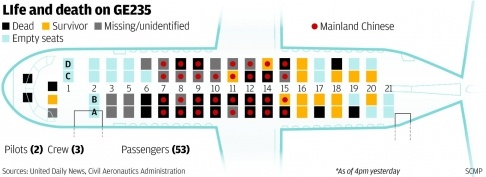 | Sơ đồ chỗ ngồi trên máy bay GE235. Màu vàng thể hiện chỗ ngồi những người sống sót. Màu đen là những người thiệt mạng. Màu ghi: những người mất tích, màu xanh: ghế trống. Cánh quạt bị hỏng là cánh quạt trái, phía dưới của ảnh. Đồ họa: SCMP |