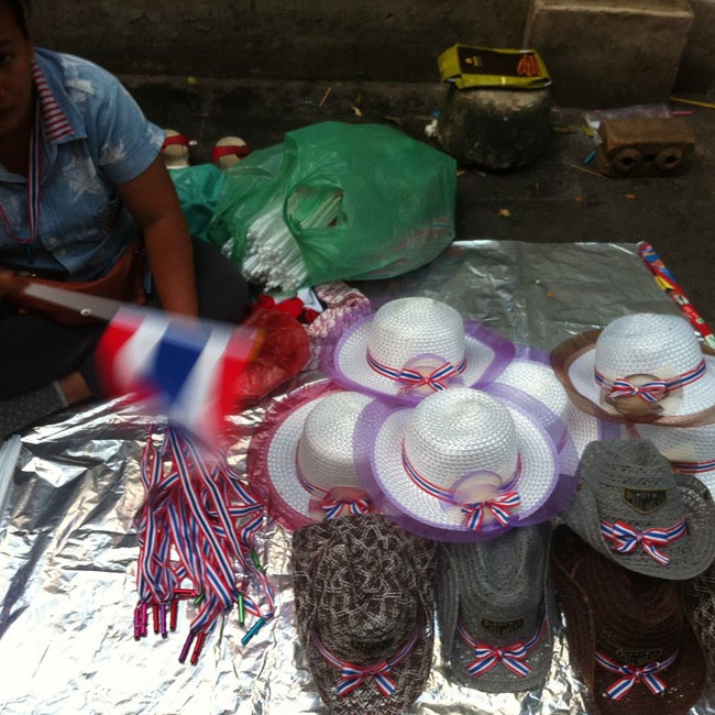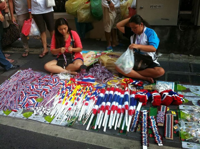 Cờ, còi, mũ, đồ ăn... là những gì người biểu tình ở Thái Lan cần trong những ngày này, và đó cũng là nguồn kinh doanh của nhiều người dân.