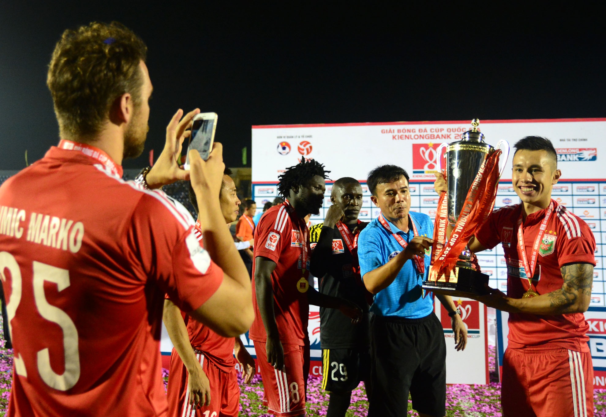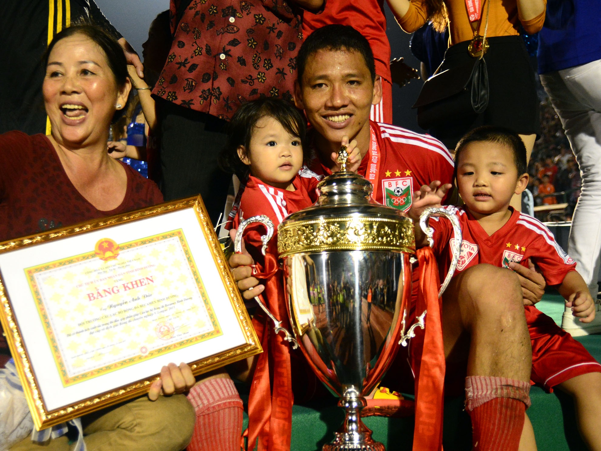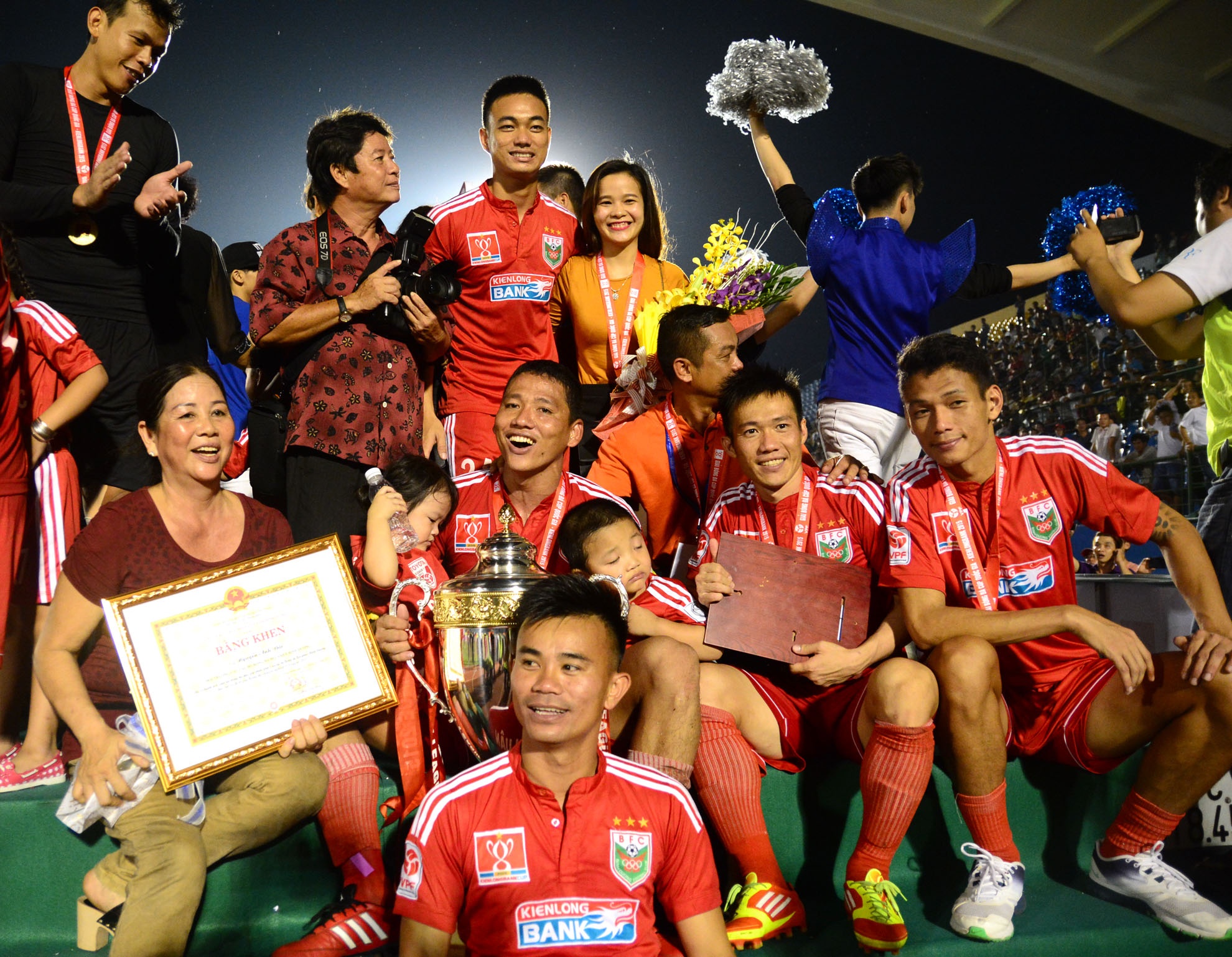 | Người thân các cầu thủ ăn mừng, chụp ảnh kỉ niệm với huy chương và chiếc Cúp Quốc Gia. |