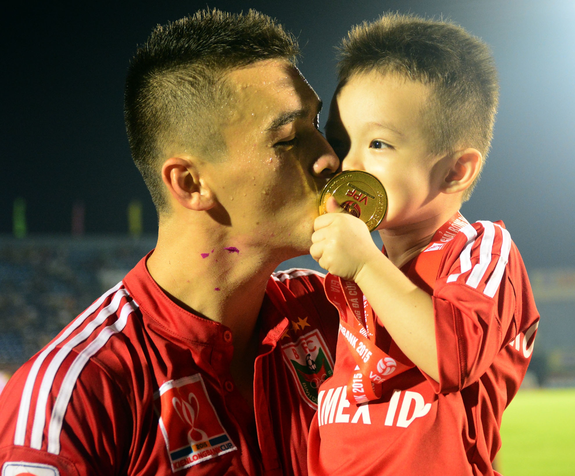 | Đặng Văn Robert cùng cậu con trai hôn lên chiếc huy chương vàng anh và đội cùng giành được. |