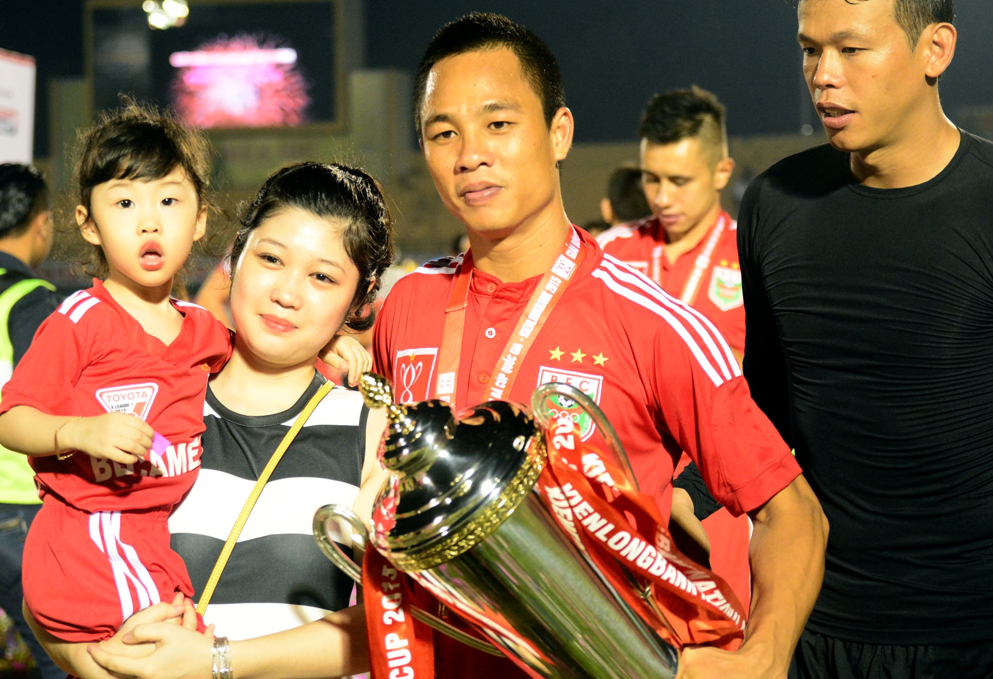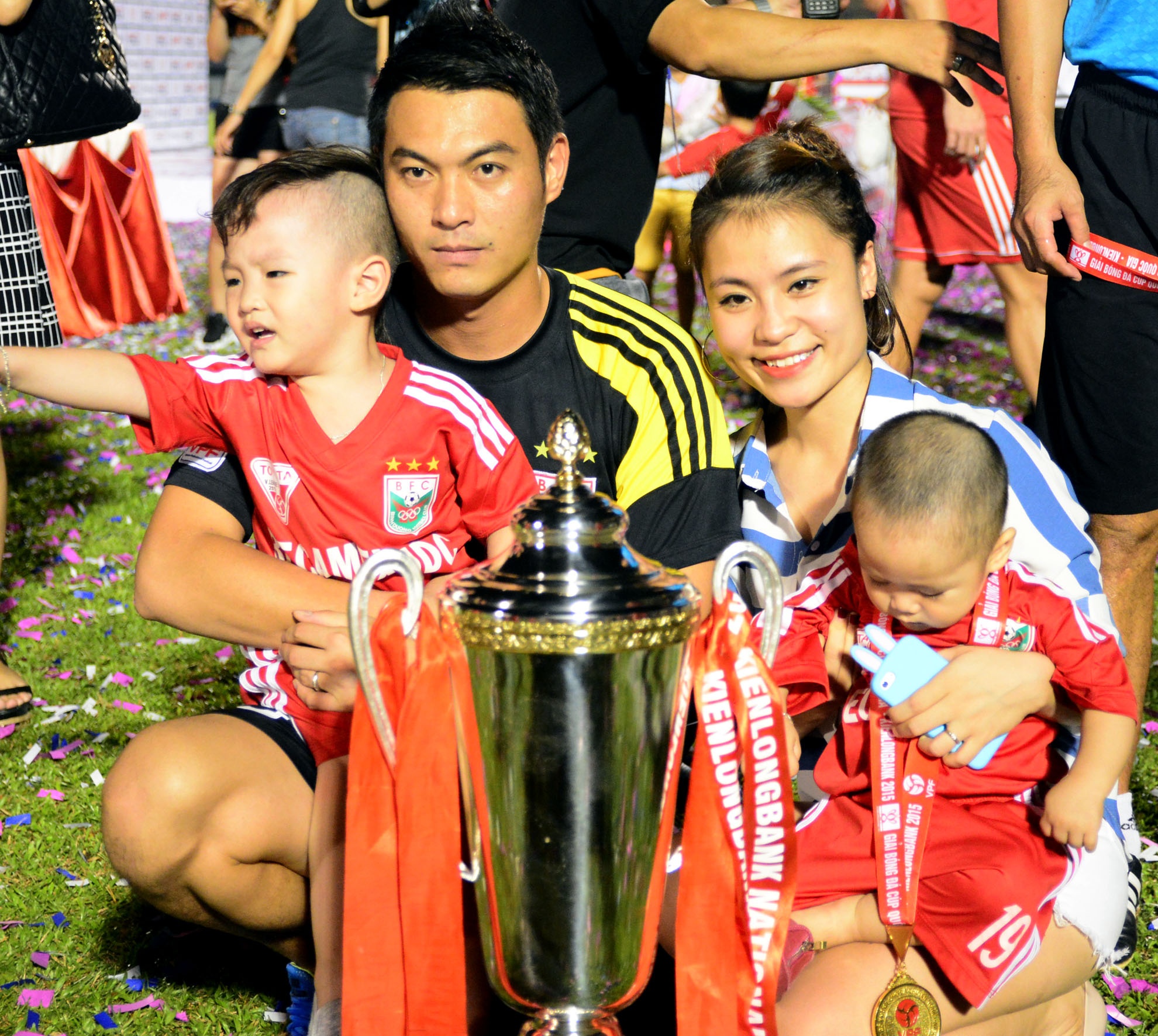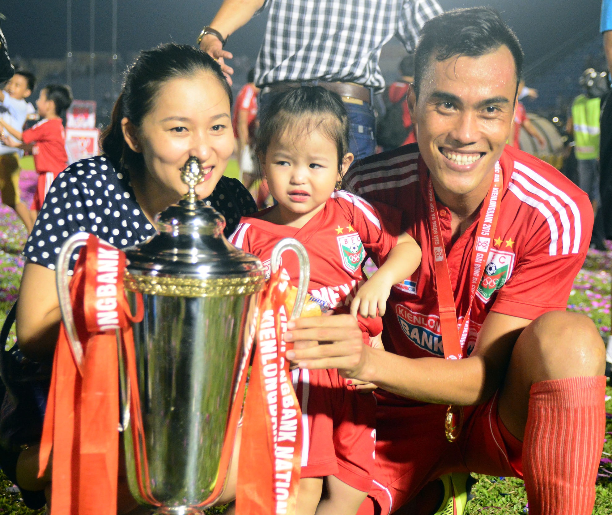 | Vợ con của hậu vệ Nguyễn Xuân Thành đến theo dõi trên khán đài và cùng xuống sân ăn mừng khi anh cùng đội bóng nhận cúp. |