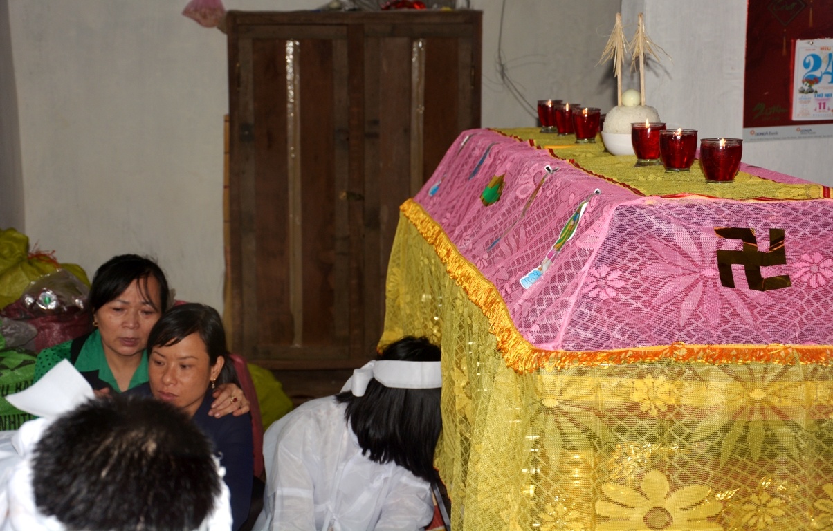 Bất chấp cơ mưa mỗi lúc một lớn dần, hàng trăm người dân vẫn đến để thắp hương chia buồn với thân nhân người xấu số. Thanh niên trong làng tập trung dựng rạp, khiêng bàn ghế và phục vụ nước uống cho khách. Trong nhà, cổ quan tài của ông Vấn nghi ngút khói hương.