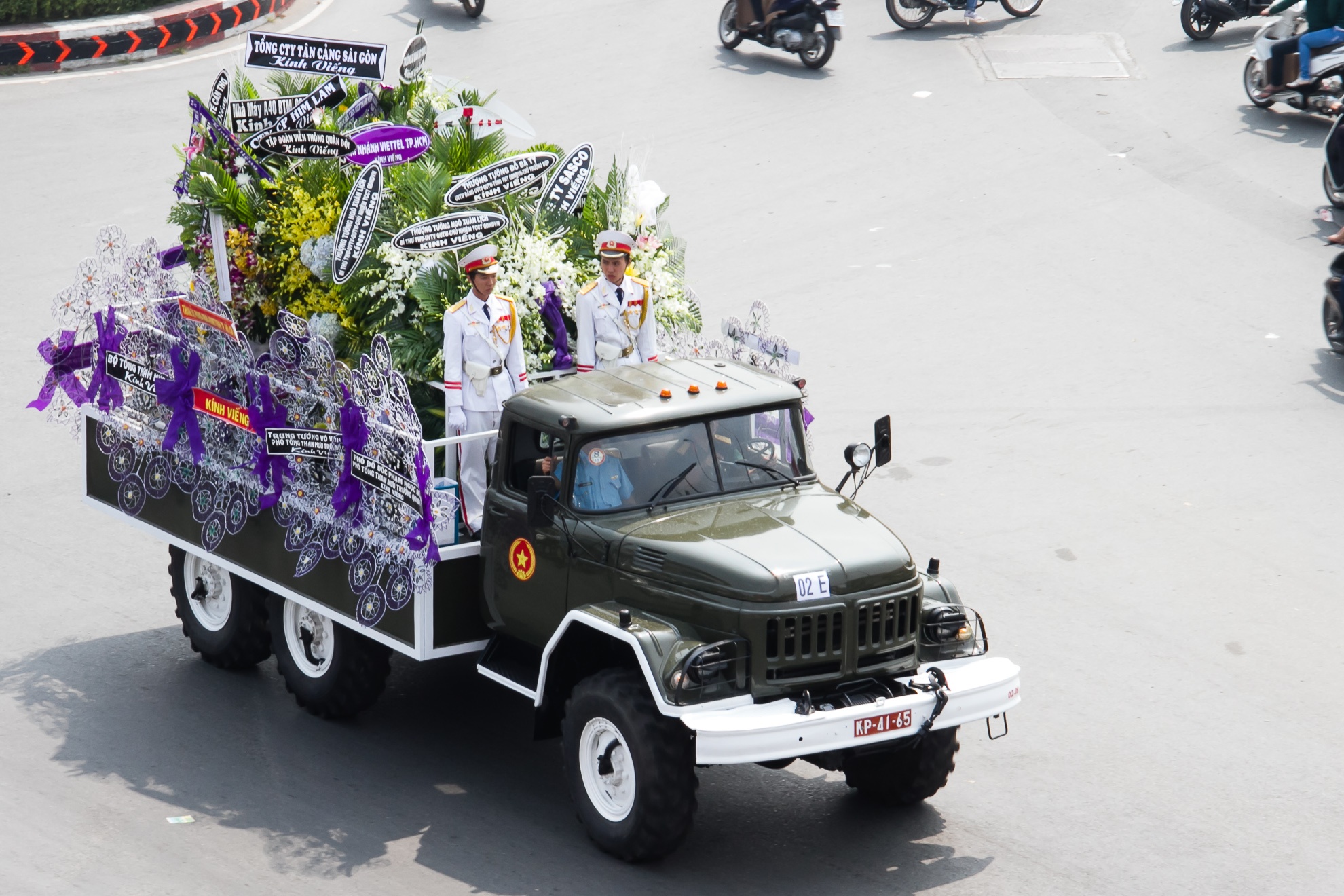 Sau lễ truy điệu, ban tổ chức cho các quân nhân thực hiện nghi thức hạ cờ, làm lễ đưa các chiến sĩ ra xe tang chờ sẵn ở sân nhà tang lễ của Bộ Quốc phòng.