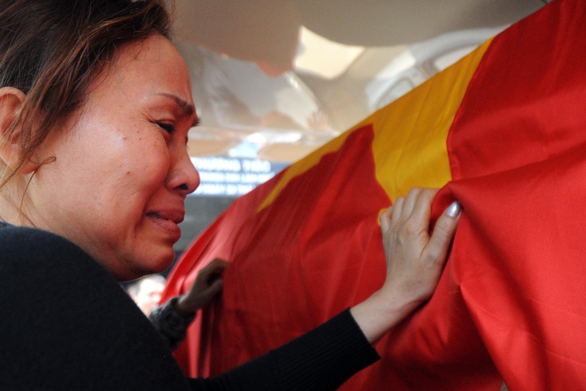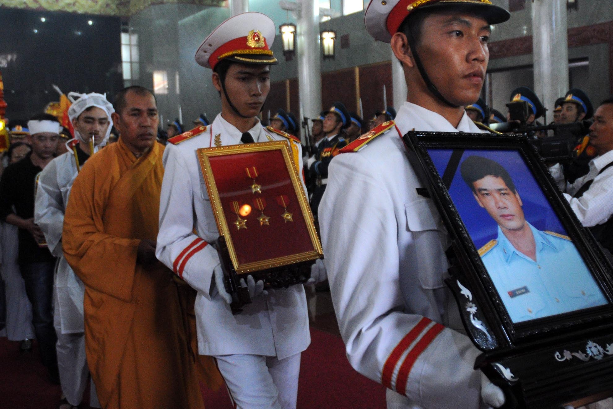 | Thi hài các quân nhân hy sinh được đưa đi an táng, hỏa táng tại nghĩa trang Bình Hưng Hòa. Riêng trung tá Lê Hồng Quân được đưa về Nghệ An theo nguyện vọng của gia đình. Mọi người không kìm nén được nước mắt khi chứng kiến giây phút chia ly. Trong ảnh, người nhà của thượng úy Nguyễn Việt Cường nghẹn ngào đi theo xe tang chở di hài. |