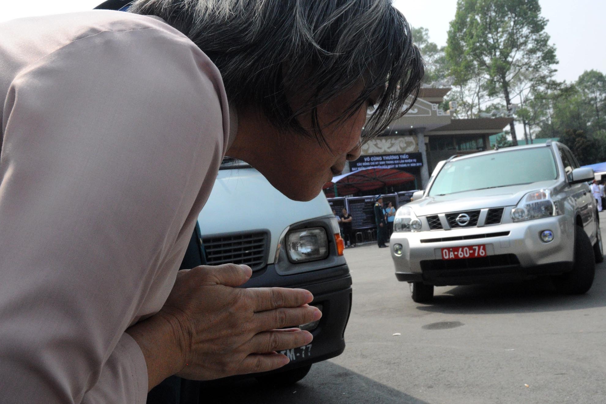 | Bà Nguyễn Thu Hương (54 tuổi) đồng nghiệp với vợ của Thiếu tá Lê Hồng Quân chỉ kịp đến vừa lúc xe tang chở các anh lăn bánh về nghĩa trang. |